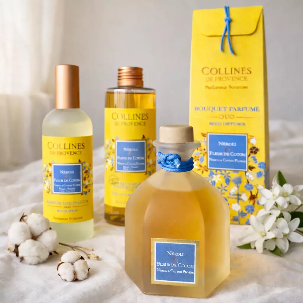 Аромадиффузор Collines de Provence «Нероли и цветок хлопка» - деликатный цветочно-пудровый аромат для дома, который создает ощущение чистоты, легкости и уюта.