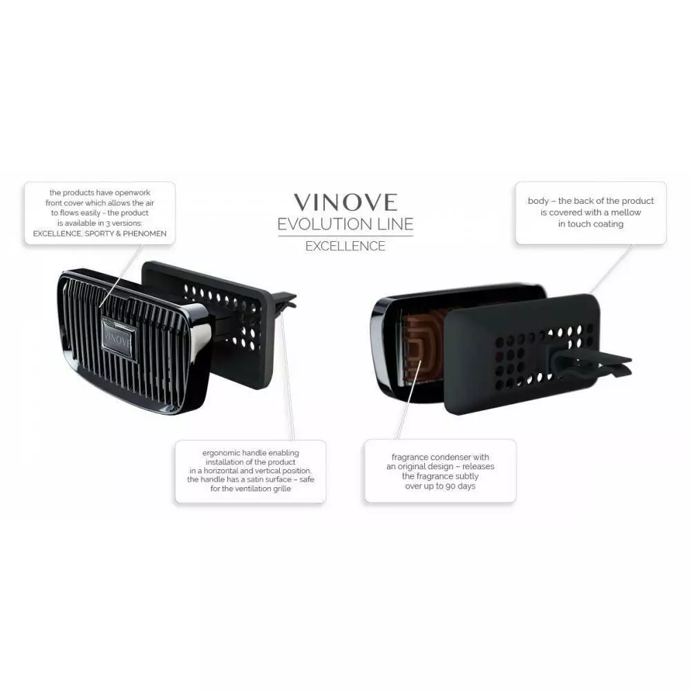 Эксклюзивные духи VINOVE созданы международной командой легендарных французских дизайнеров парфюмерии, итальянских дизайнеров и польских ученых. Автомобильные духи VINOVE находятся в полностью безопасном для интерьера автомобиля, прочном полимерном корпусе аромадиффузора, который вмещает ароматический конденсатор.