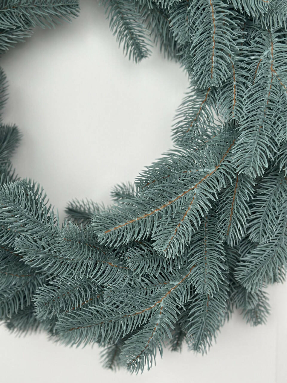 Венок изготовлен из искусственной литой хвои (полиэтилен), которая по форме и цвету имитирует веточки живой голубой ели. Оттенок — естественный голубовато-зелёный, максимально приближённый к натуральной хвое, без искусственного блеска и ярких тонов. Веточки равномерно расположены по кругу, формируя аккуратную, ухоженную крону.