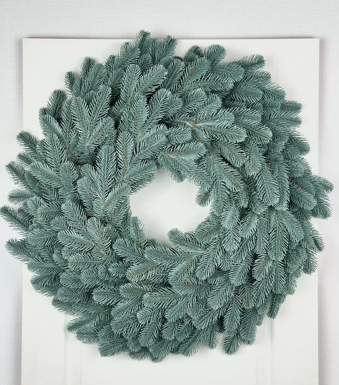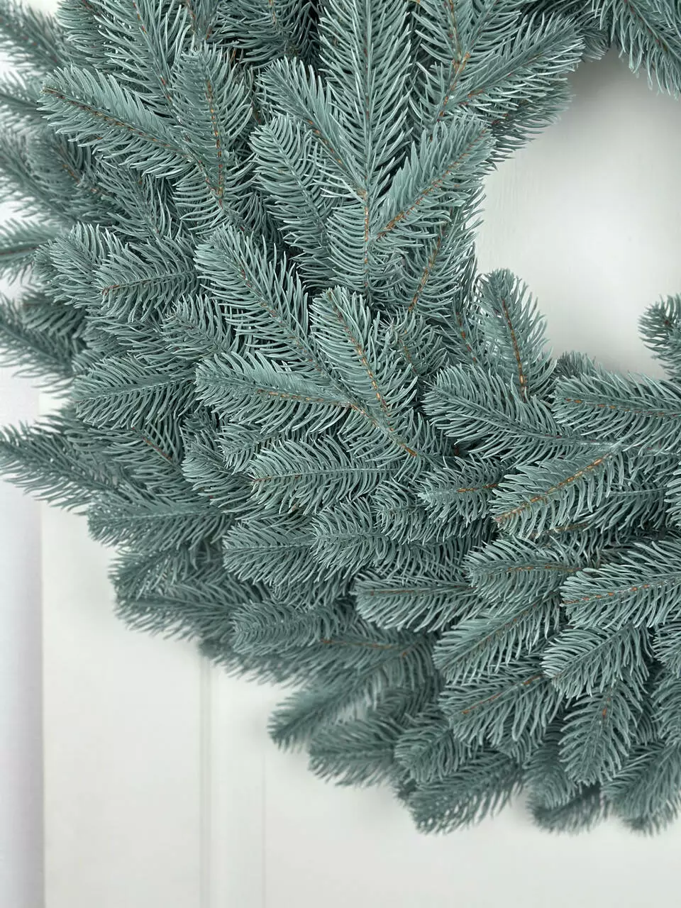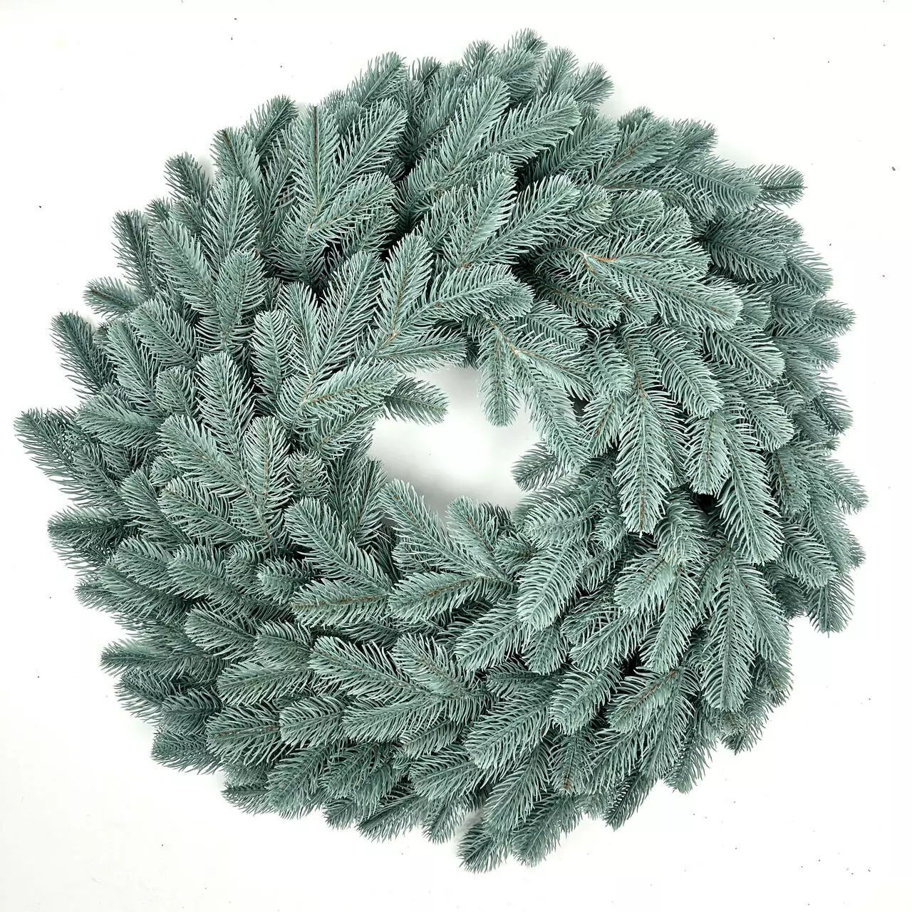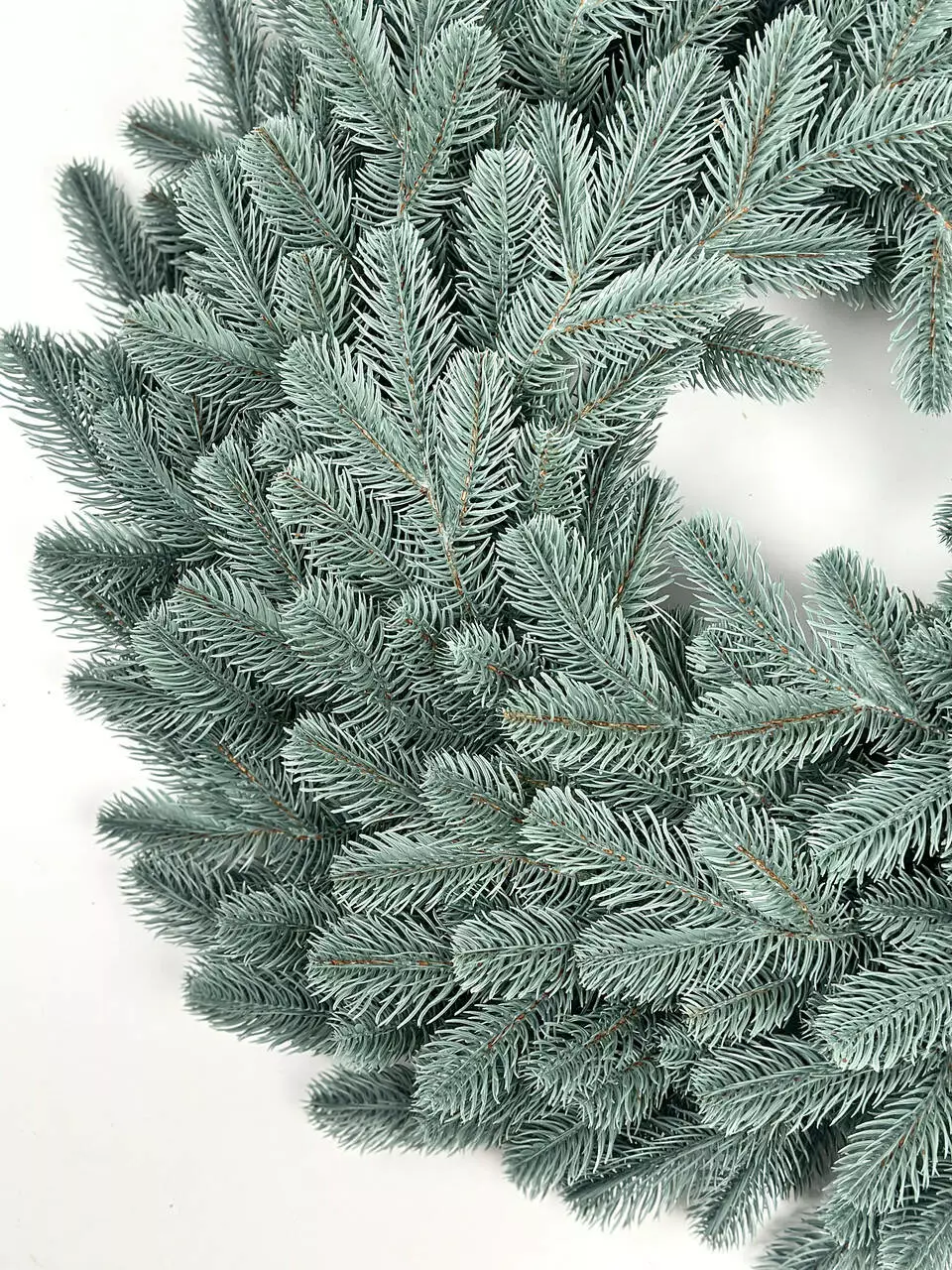 Венок изготовлен из искусственной литой хвои (полиэтилен), которая точно передаёт форму и текстуру веточек живой голубой ели. Цвет — естественный голубовато-зелёный, максимально приближённый к натуральной хвое, без искусственного блеска и ярких оттенков. Веточки плотно расположены по кругу, формируя густую крону с широким бортом и меньшим внутренним отверстием, что усиливает визуальный объём венка.