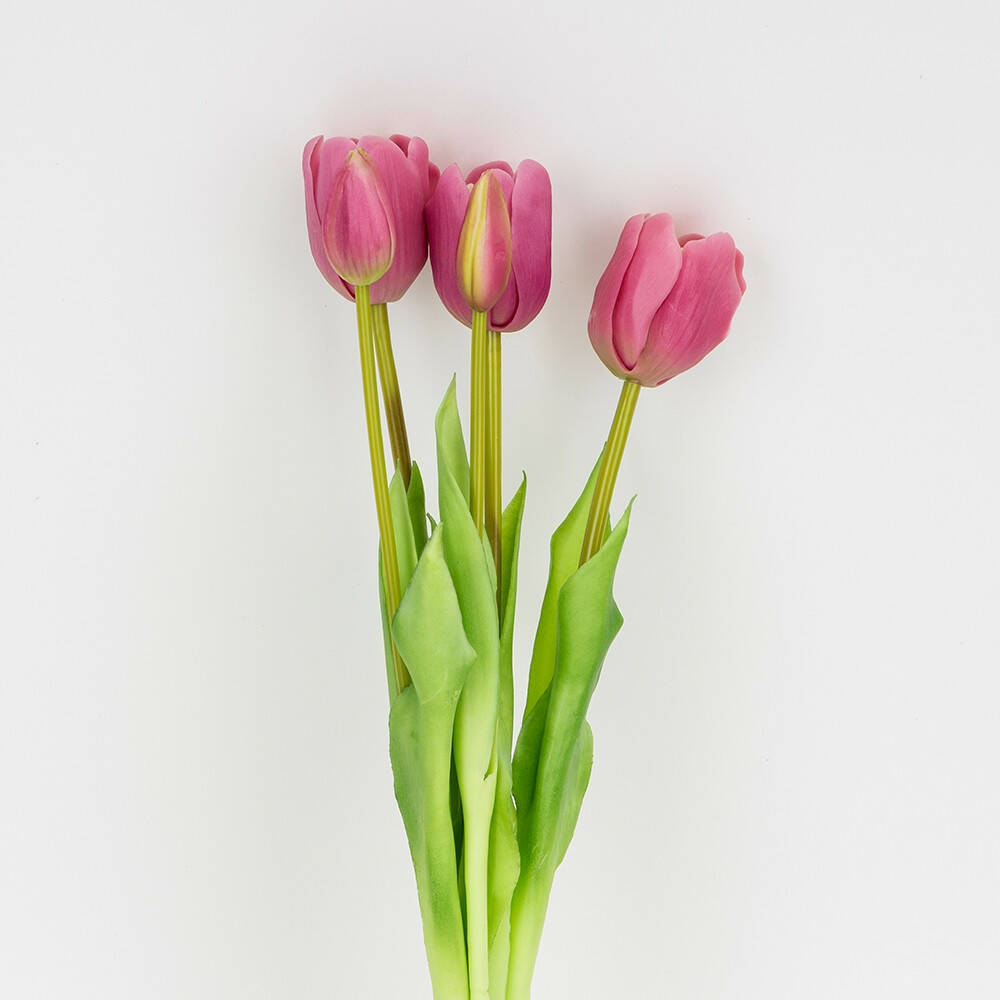 Букет латексных тюльпанов в лилово-розовом оттенке смотрится нежно, элегантно и максимально реалистично. Бутоны диаметром около 5 см имеют естественную форму и детализированную серединку, а мягкая матовая поверхность латекса точно передает текстуру живых цветов даже при близком рассмотрении.