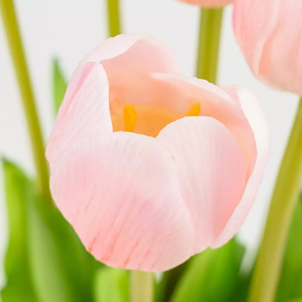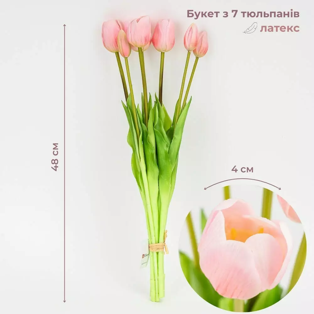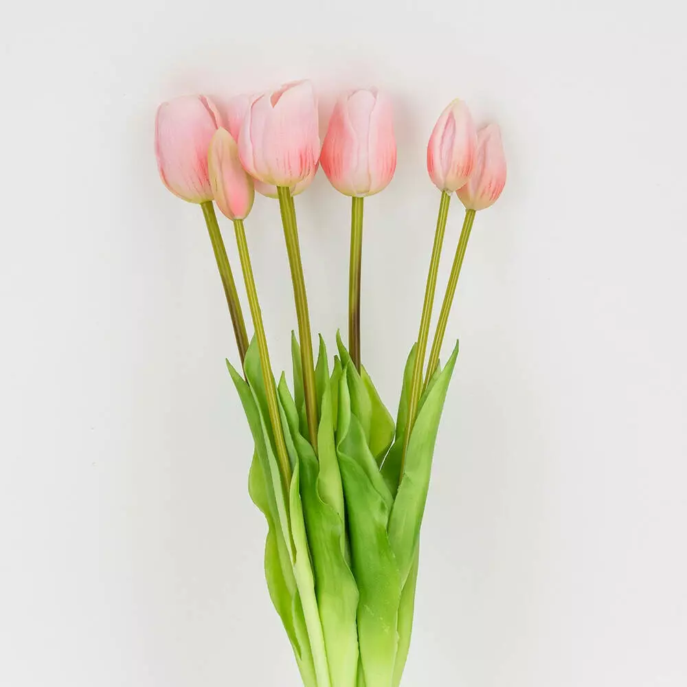 Букет латексных тюльпанов в нежно-розовом цвете смотрится чрезвычайно реалистично и элегантно, создавая эффект живых цветов в вашем интерьере. Композиция состоит из семи аккуратных бутонов диаметром около 4 см, которые имеют естественную форму и мягкую матовую текстуру, присущую настоящим тюльпанам.