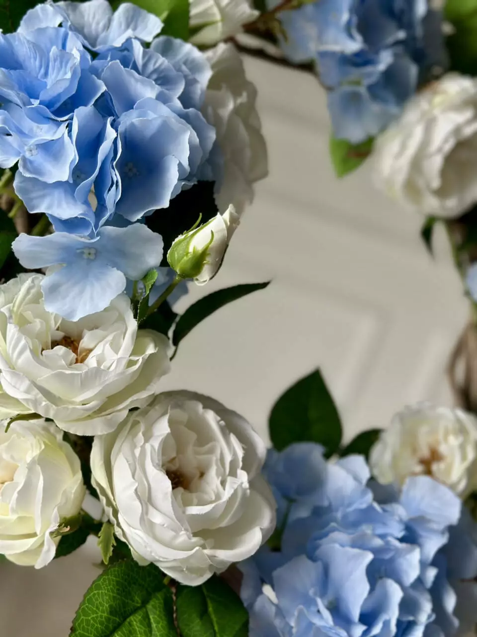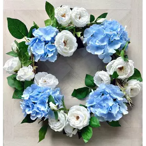 Декоративный венок из искусственных цветов Английский сад — это утончённый акцент для вашего интерьера, воплощающий эстетику аристократического сада. Гармоничное сочетание голубой гортензии и белых английских роз создаёт нежную и одновременно элегантную атмосферу. Натуральная основа из ветвей глицинии придаёт венку природную текстуру и изысканный шарм.