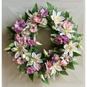 Декоративный венок из искусственных цветов «Весенний сад» c диаметром 50 см — это изделие ручной работы, вдохновлённое природной красотой сада в расцвете. Реалистичные клематисы, космеи и хризантемы в нежных розовых, белых и сиреневых оттенках гармонично сочетаются с зеленью, создавая лёгкую, воздушную композицию.