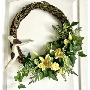 Почувствуйте весеннее настроение в своем интерьере с этим нежным венком, который поражает своей красотой и теплом. Он создан с использованием жёлтых цветов: клематиса и роз, придающих ему особую нежность и свежесть. Украшенный плющом, этот венок имеет природный и элегантный вид.