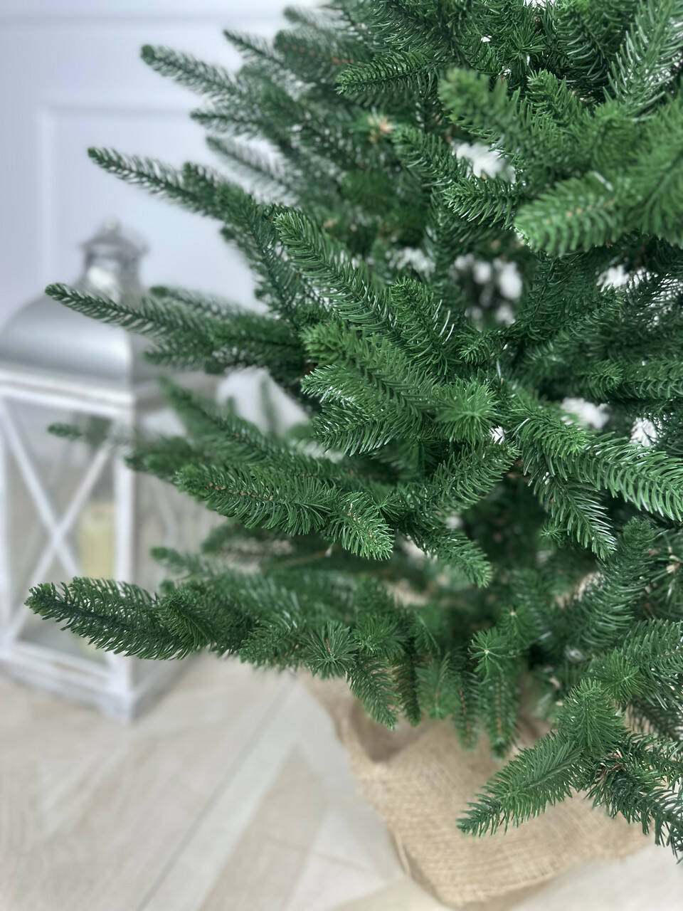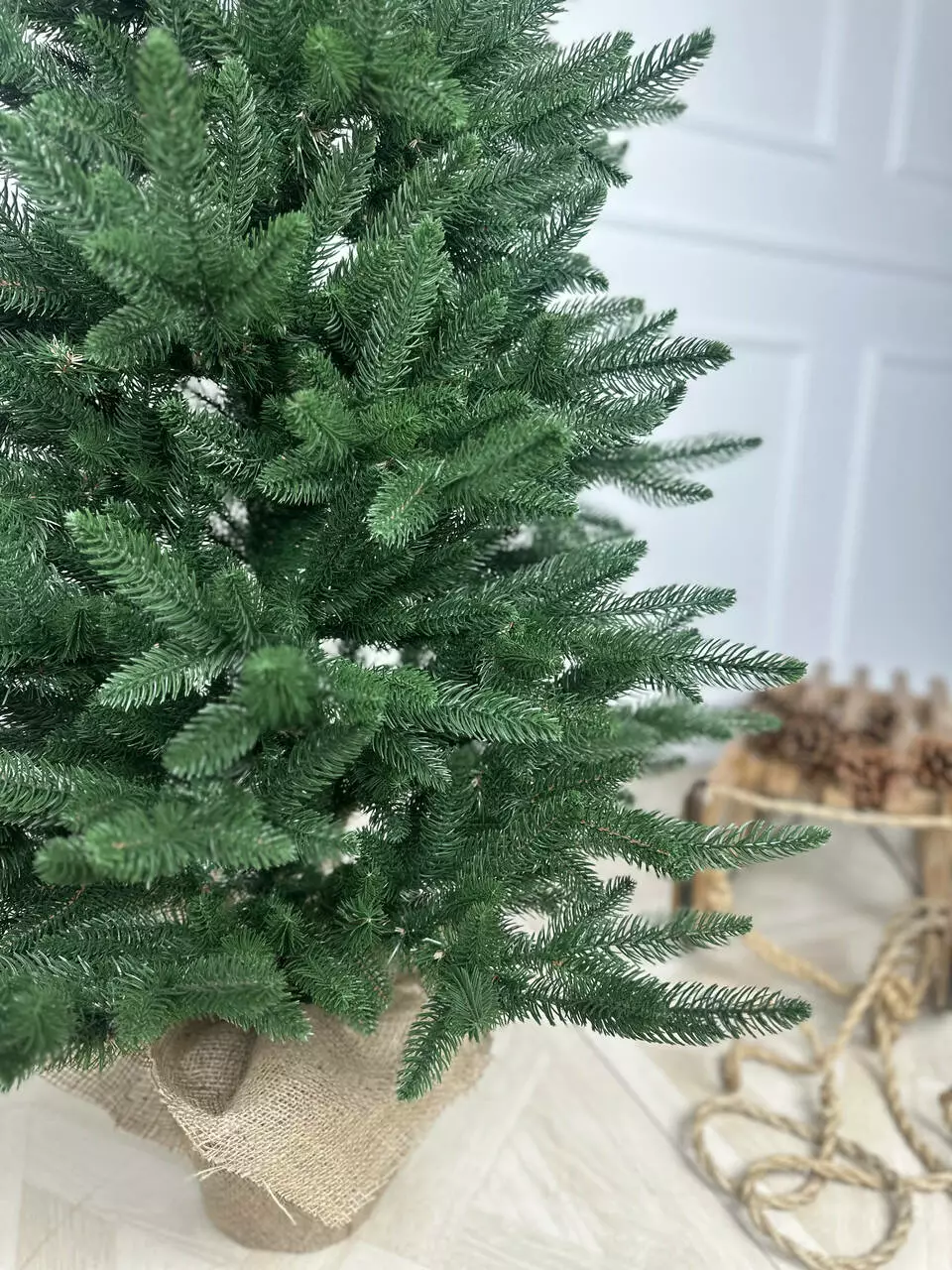 Ёлка оформлена натуральной мешковиной, что придаёт ей уютный, декоративный характер и позволяет гармонично вписаться в современные интерьеры — от классических и скандинавских до эко-стиля.
