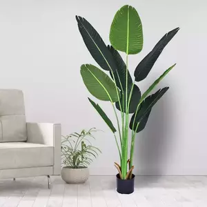 Создайте атмосферу тропиков в своём интерьере с искусственным банановым деревом высотой 160 см. Его реалистичные листья с насыщенными зелёными оттенками придают естественность и элегантность любому помещению. Изготовленное из качественных материалов, дерево не требует ухода, не выцветает и долго сохраняет безупречный вид. Идеальное решение для дома, офиса, кафе, салона красоты или ресторана. Поставляется в стильном чёрном горшке, который гармонично дополняет общий вид композиции.