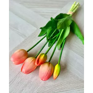 Изысканный букет искусственных тюльпанов в нежном коралловом оттенке — стильное дополнение к интерьеру, фотозоне или подарочному оформлению. Благодаря мягкому латексу и технологии Real Touch, цветы выглядят натурально и имеют приятную текстуру, почти не отличаясь от живых.