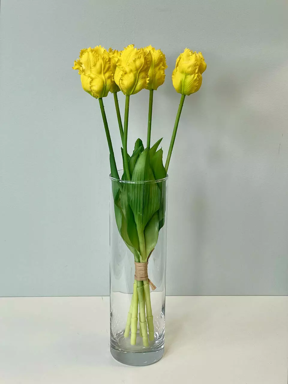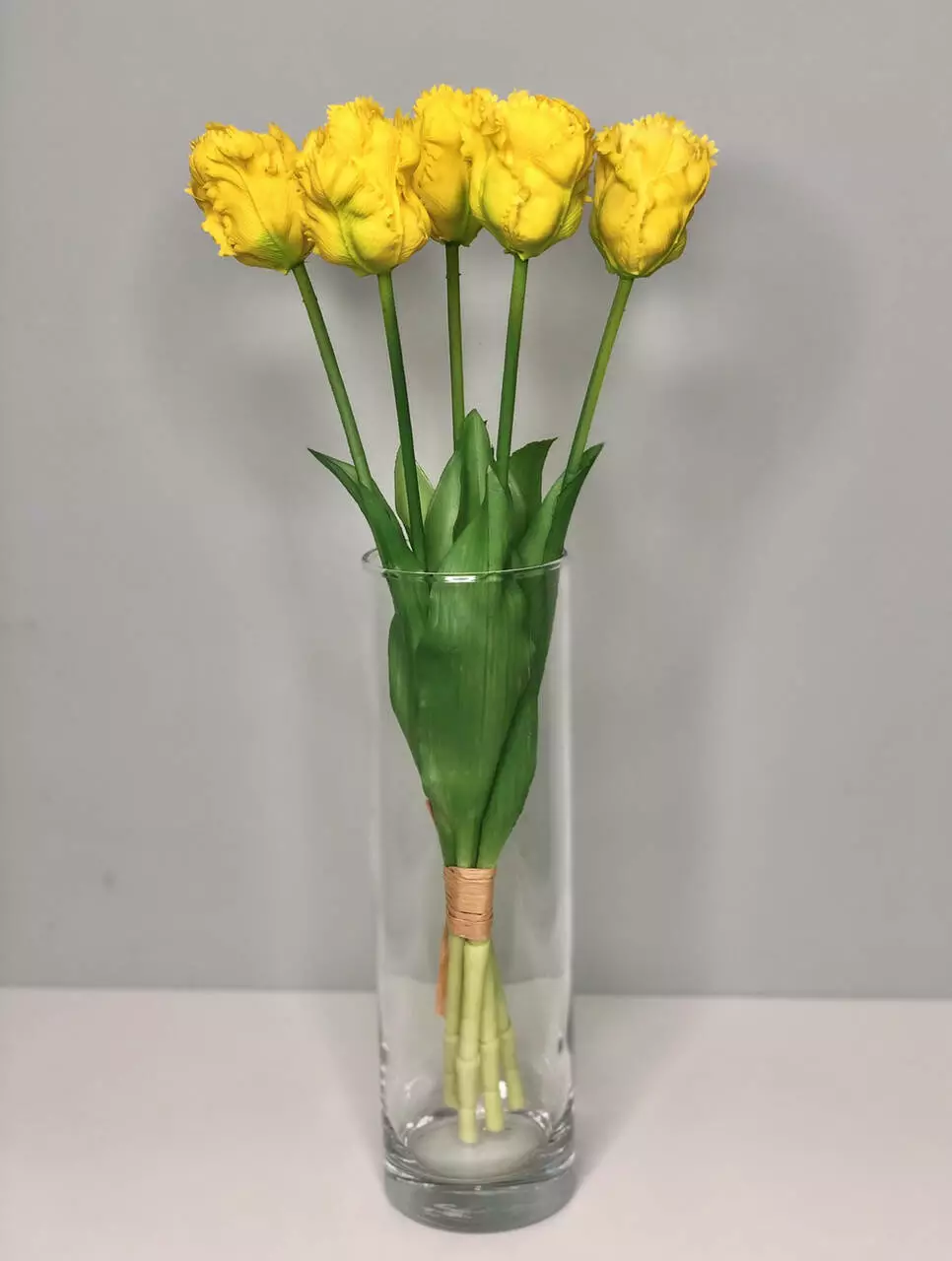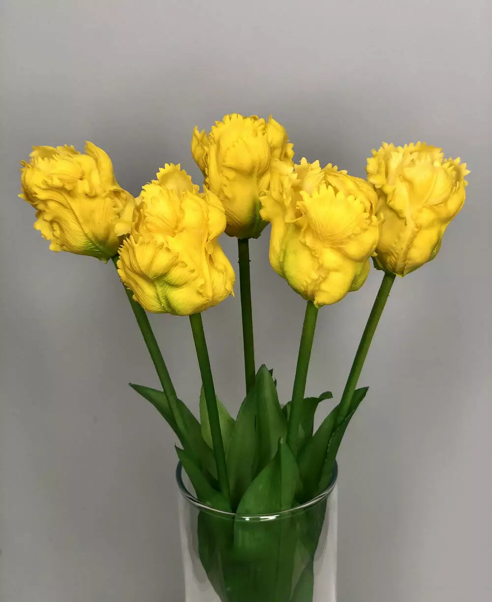 Букет состоит из 5 жёлтых тюльпанов. Каждый цветок имеет диаметр 4 см, а общая высота букета составляет 41 см. Изящные махровые лепестки придают композиции особую яркость и праздничность. Стебли и листья имеют естественный зелёный оттенок и выполнены с вниманием к деталям, что делает их максимально натуральными.