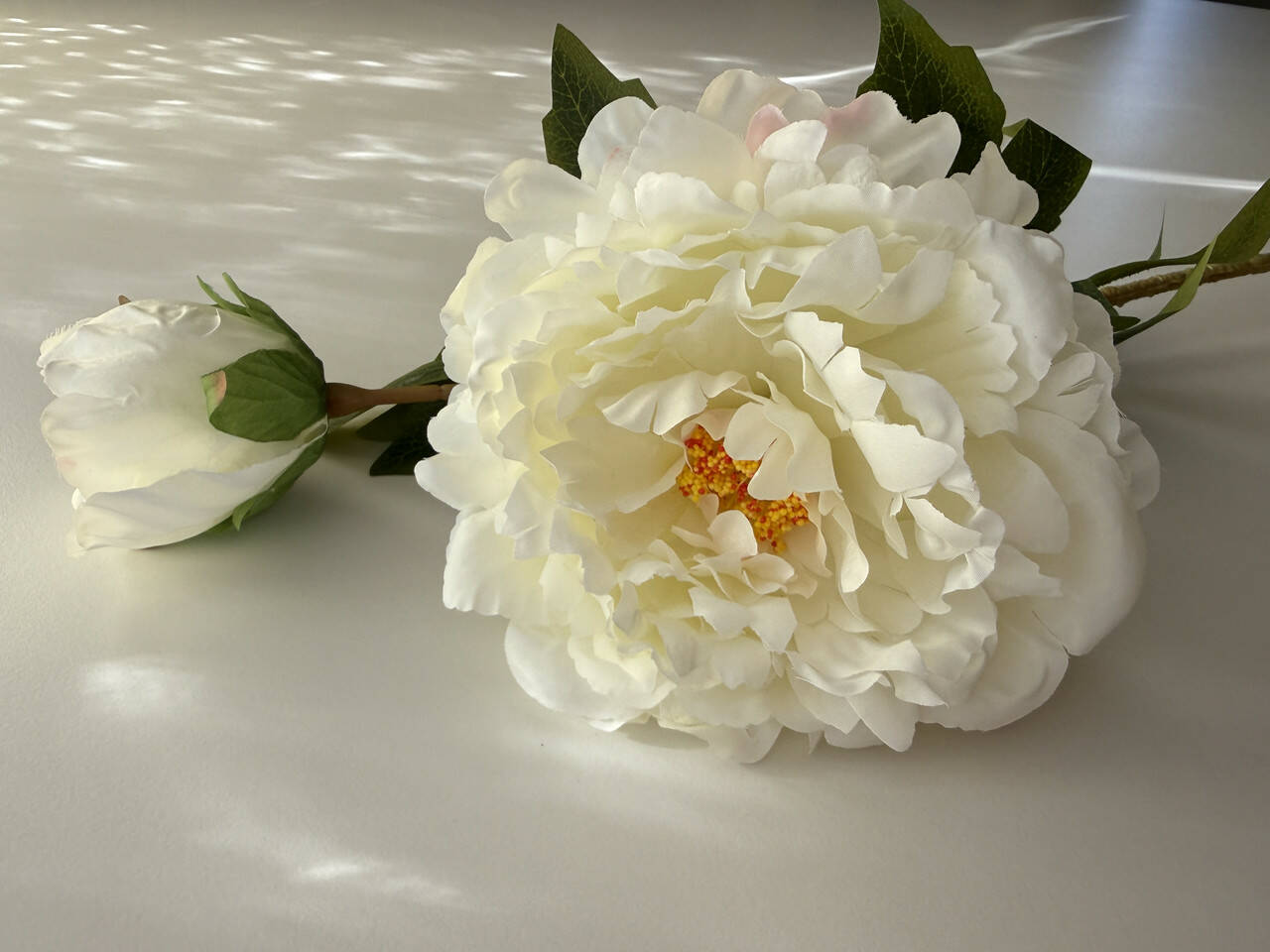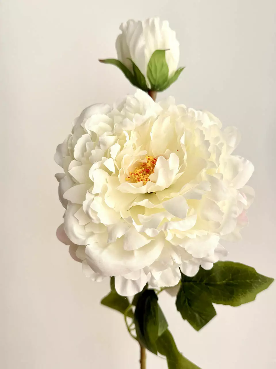 Объёмный белый пион с максимально естественной формой лепестков и выразительной серединкой — выглядит как живой цветок в пике цветения. Крупная головка диаметром 17 см создаёт акцент даже с одной ветки.