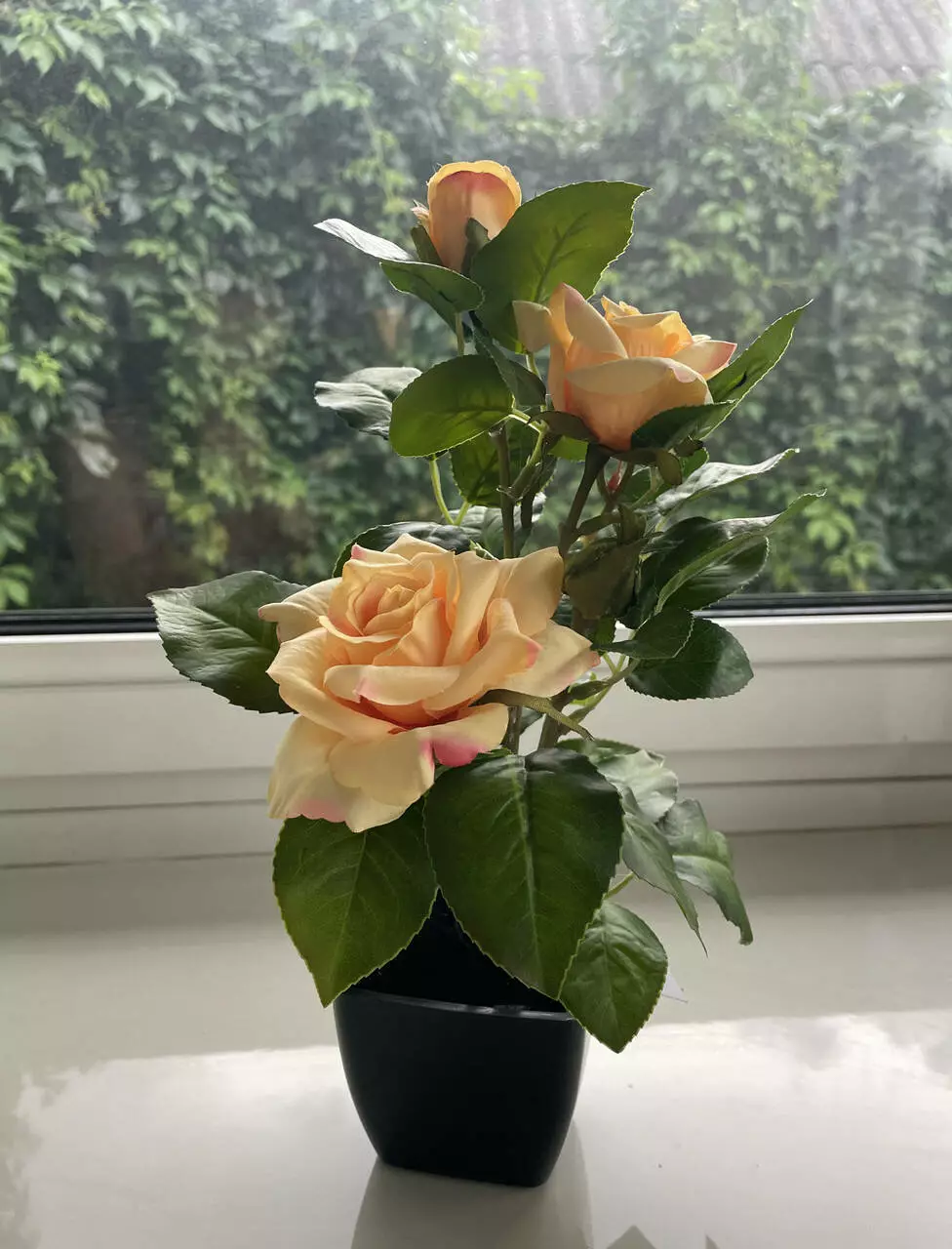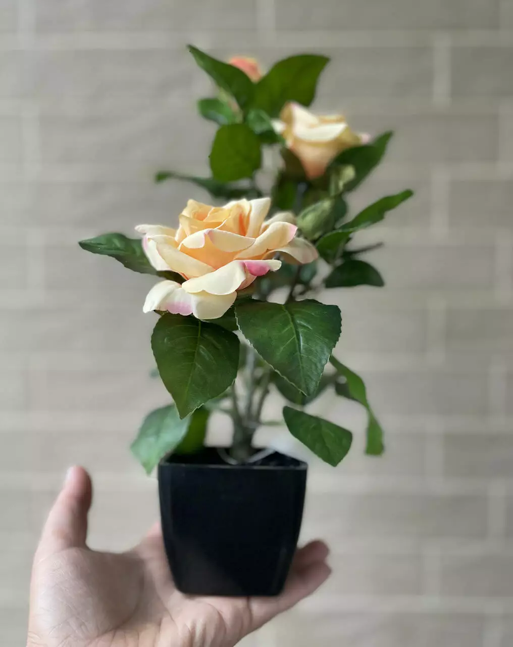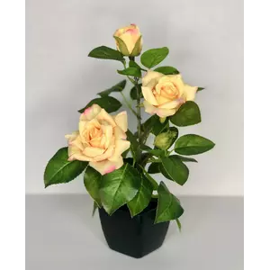 Милый кустик чайной розы добавит вашему пространству эстетики и уюта. Благодаря компактным размерам, этот вазон можно разместить где угодно. Высота вместе с горшком составляет 29 см. Роза имеет три цветка и бутон, которые выглядят как живые.