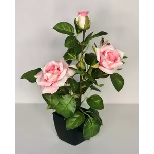 Милый кустик розовой розы добавит вашему пространству эстетики и уюта. Благодаря компактным размерам, этот вазон можно разместить где угодно. Высота вместе с горшком составляет 29 см. Роза имеет три цветка и бутон, которые выглядят как живые.