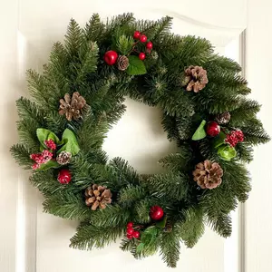 Рождественский венок серии "Elegant" изготовлен из мягкого ПВХ-пластика. Веточки имеют заостренную на кончиках форму. Венок украшен шишками и яркими красными акцентами: райскими яблочками и калиной. Диаметр венка по наружному краю составляет 50 см.