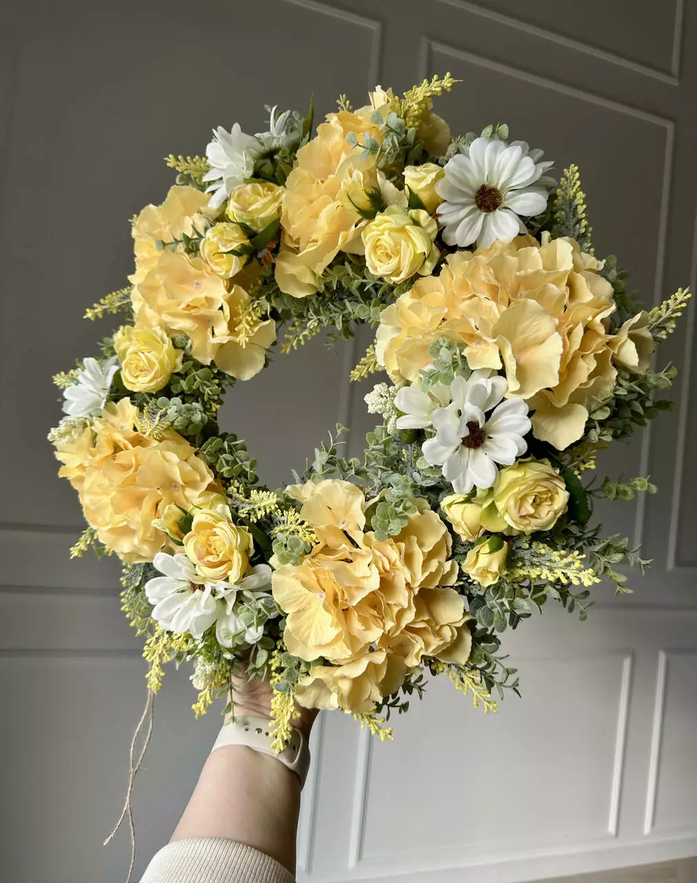 Композиция лёгкая, утончённая и гармоничная — идеально подойдёт для украшения двери, стены или светлой зоны интерьера. Этот венок — не просто декор, а эмоциональный акцент, приносящий в дом тепло, спокойствие и летнее настроение.