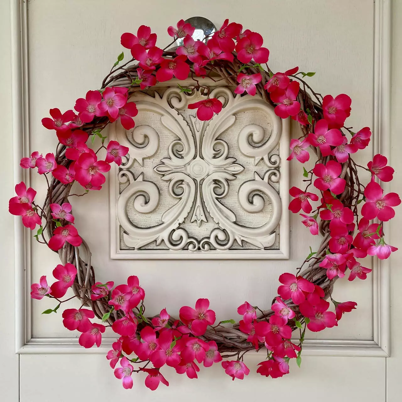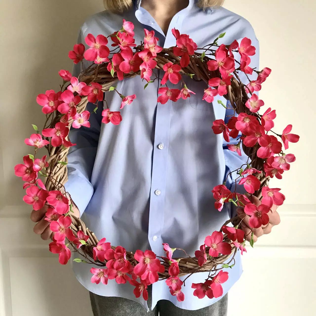 Розовый цвет цветов, воспроизводящих нежное цветение райской яблони, привносит в помещение атмосферу свежести и весенней воздушности. Каждый элемент венка создан с любовью к деталям, придавая ему естественный вид.