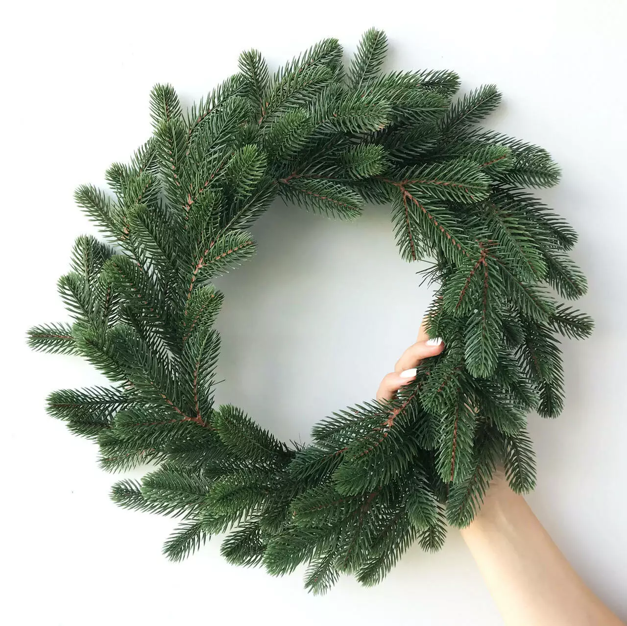 Новогодний декоративный венок диаметром 50 см представляет собой переплетенные ветки искусственной ели. Изготовлен из 100% литой хвои. Иголочки как у живой ёлки, но более мягкие и не колючие. Без декора.