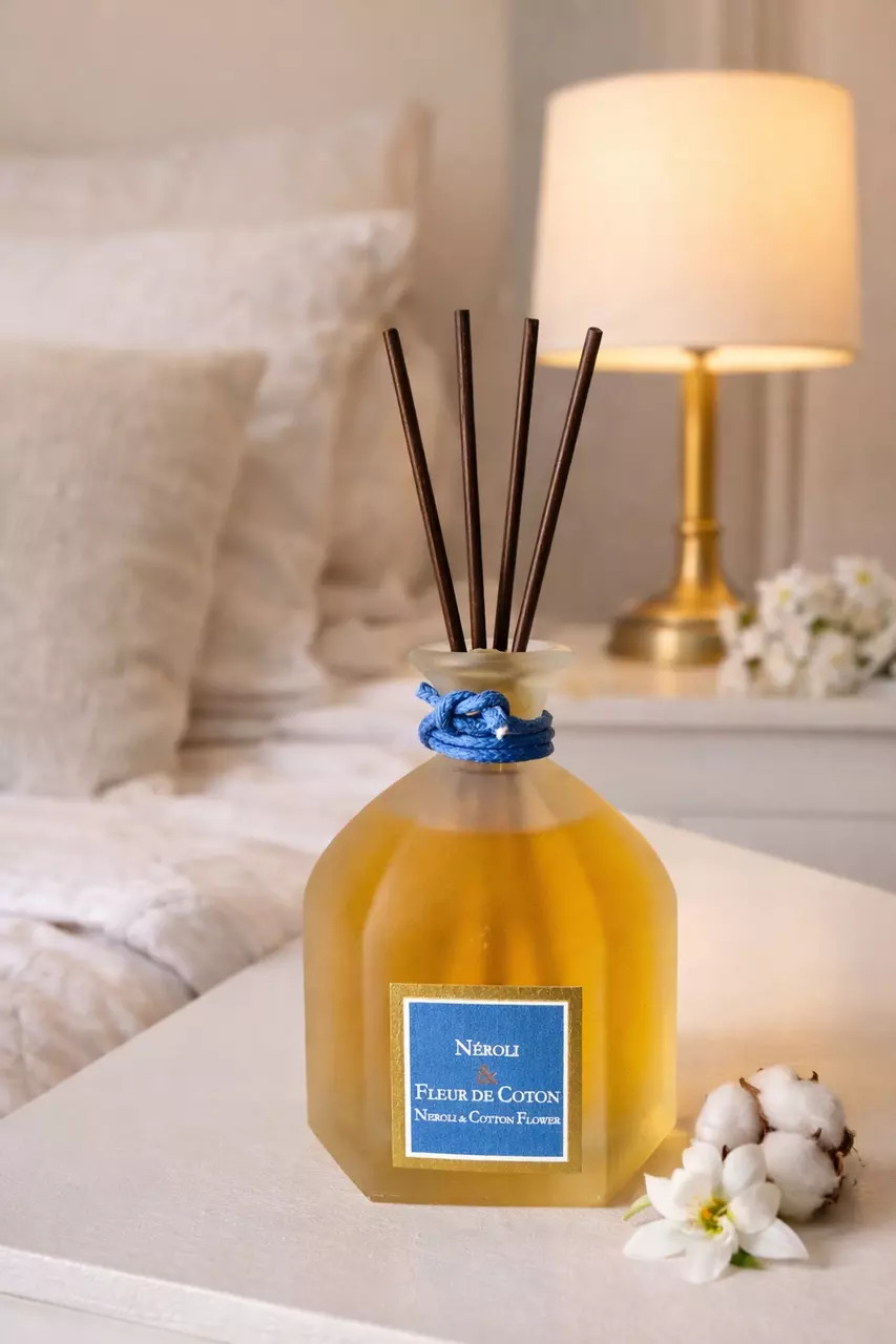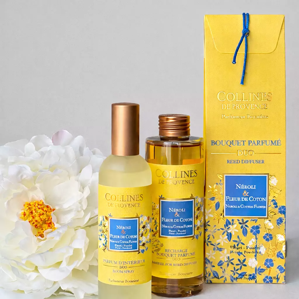 Аромадифузор Collines de Provence «Неролі та квітка бавовни» — делікатний квітково-пудровий аромат для дому, який створює відчуття чистоти, легкості та затишку.