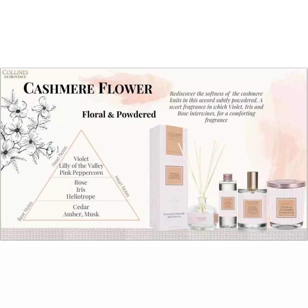 В ідкрийте собі заново м'якість кашемірового трикотажу в цьому, трохи припудреному, акорді. Солодкий аромат, в якому переплітаються фіалка, ірис та троянда, створюючи заспокійливий аромат.