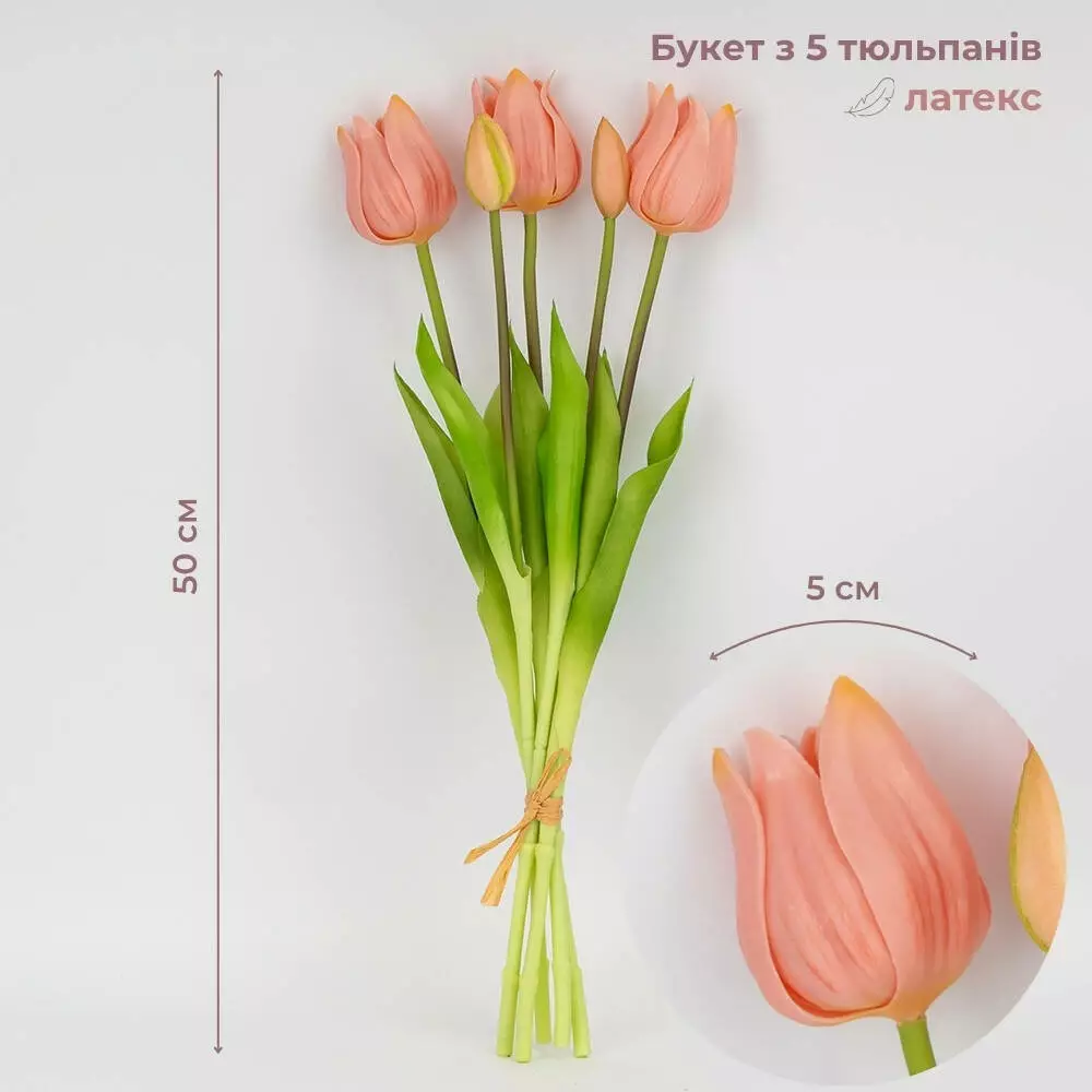 Букет латексних тюльпанів, 5 бутонів, персиково-рожевий, 50 см