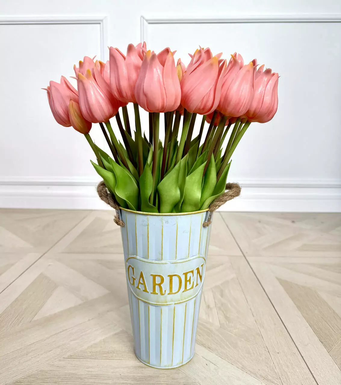 Тюльпани зібрані у букет і перев’язані декоративною мотузкою, яку можна зняти, щоб поєднати кілька букетів і створити більшу, пишну композицію.