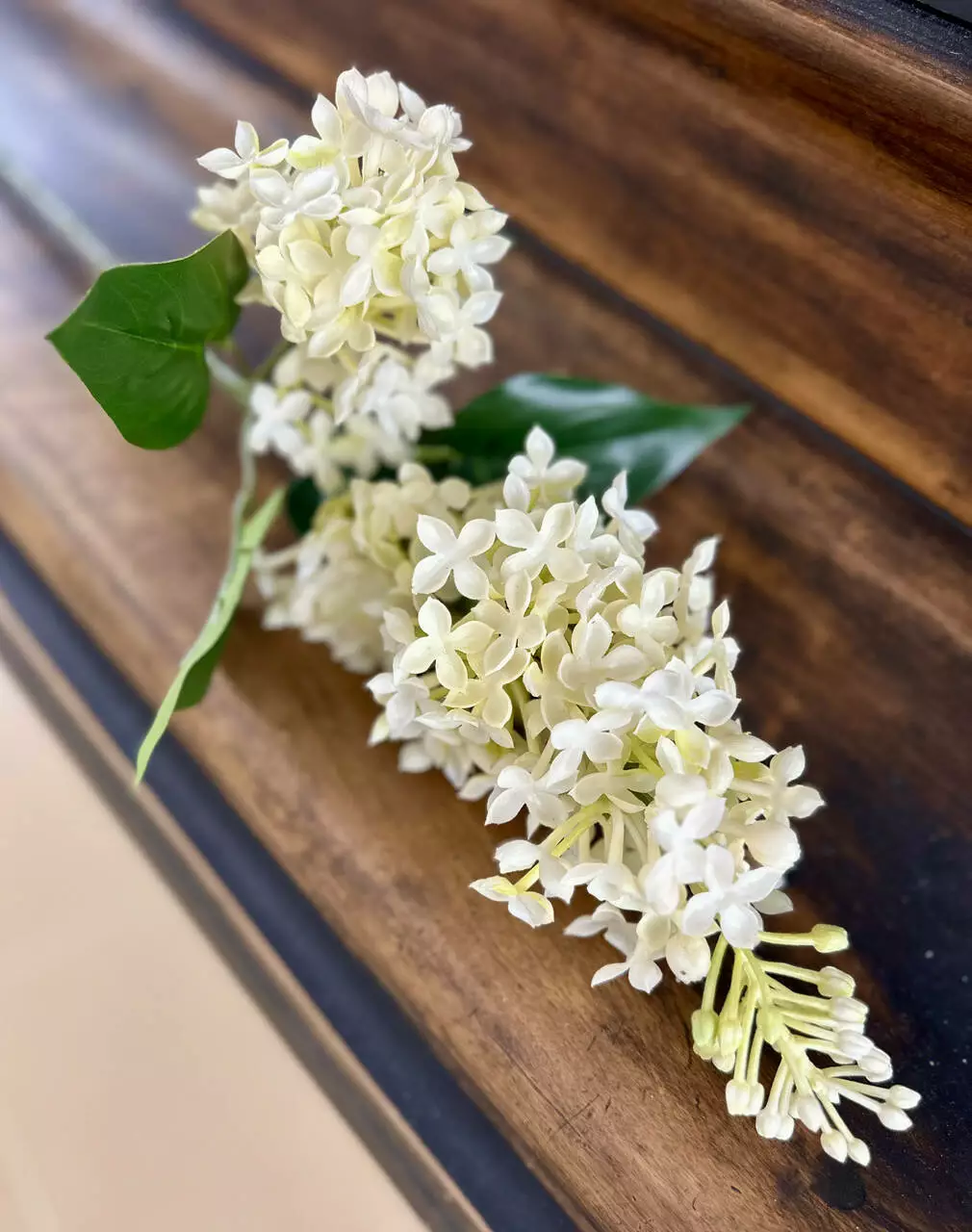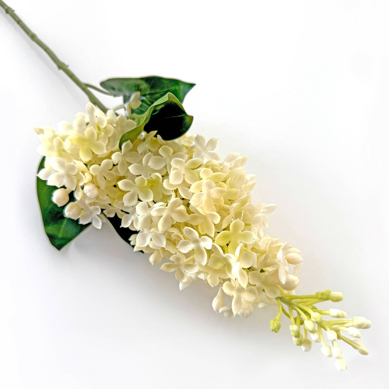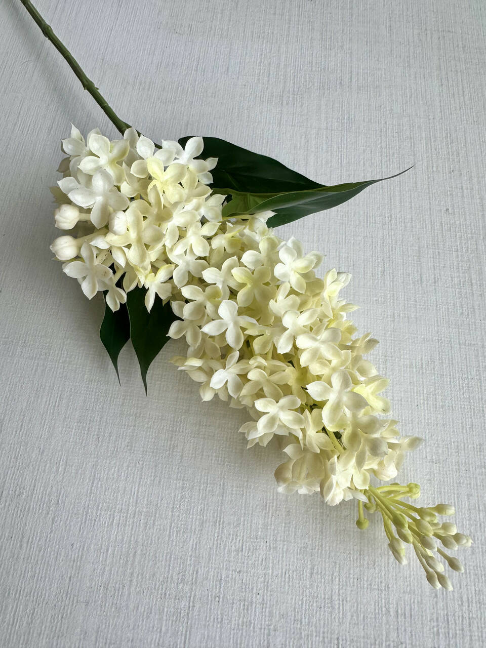 Реалістична гілка бузку з латексними квітами та декоративним листям. М’який латекс надає пелюсткам природну форму та фактуру, завдяки чому квіти виглядають максимально наближеними до живих.