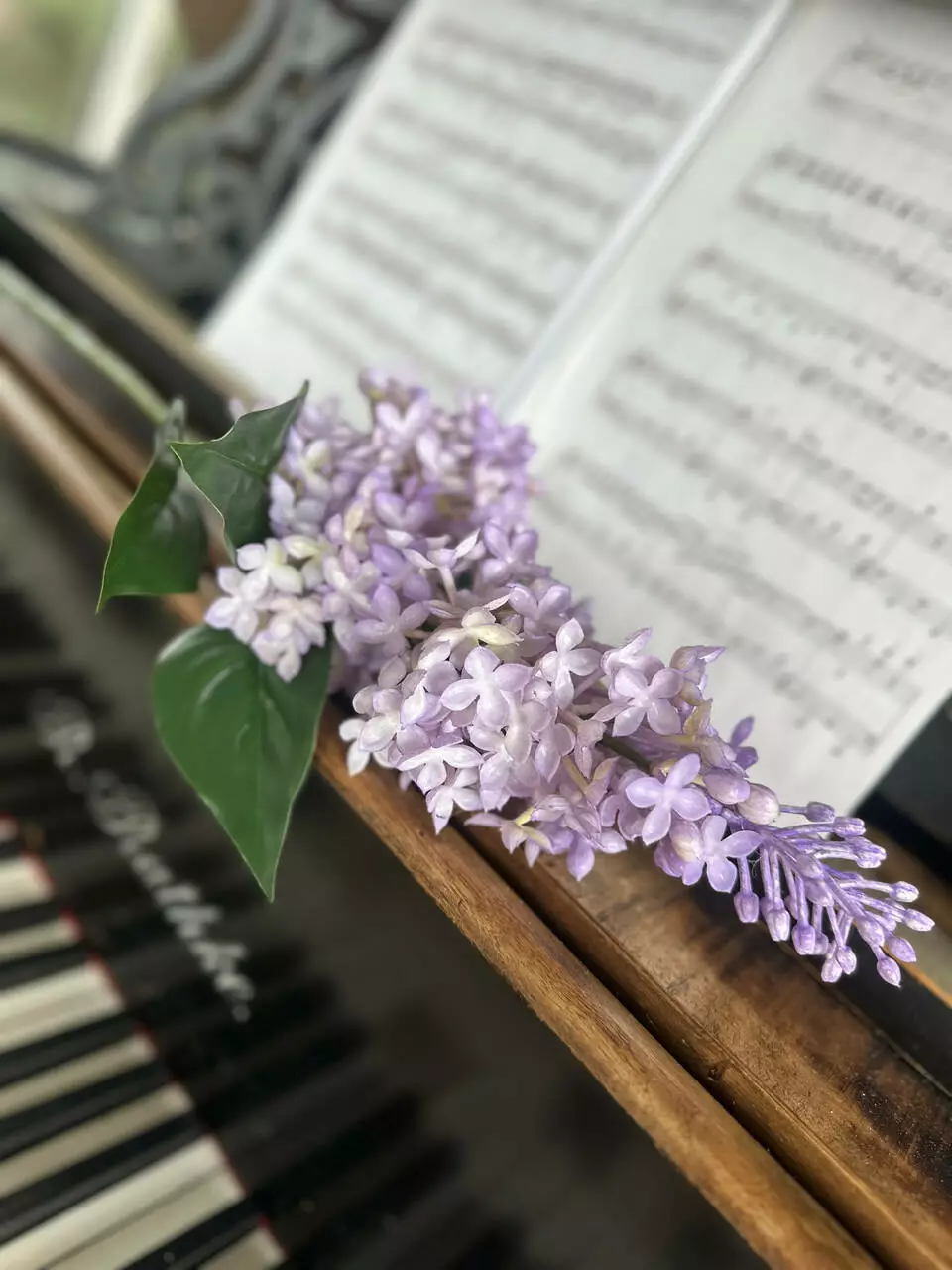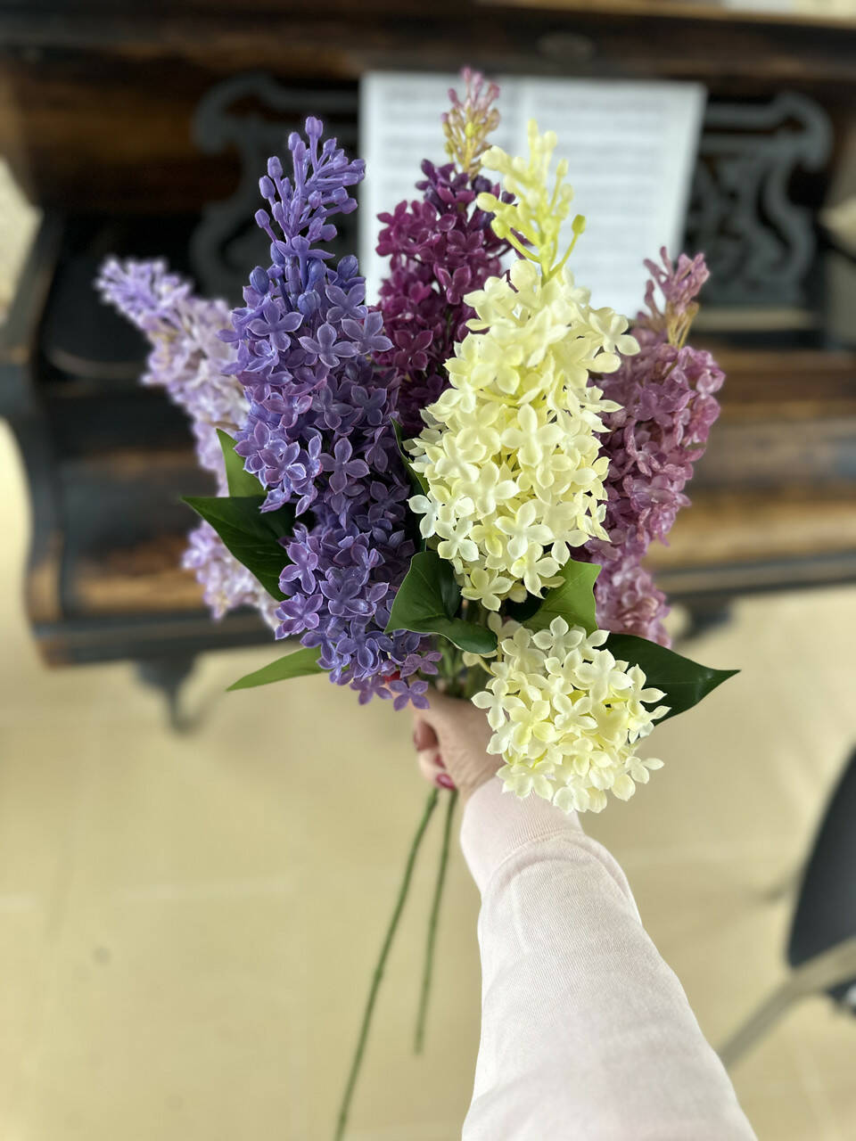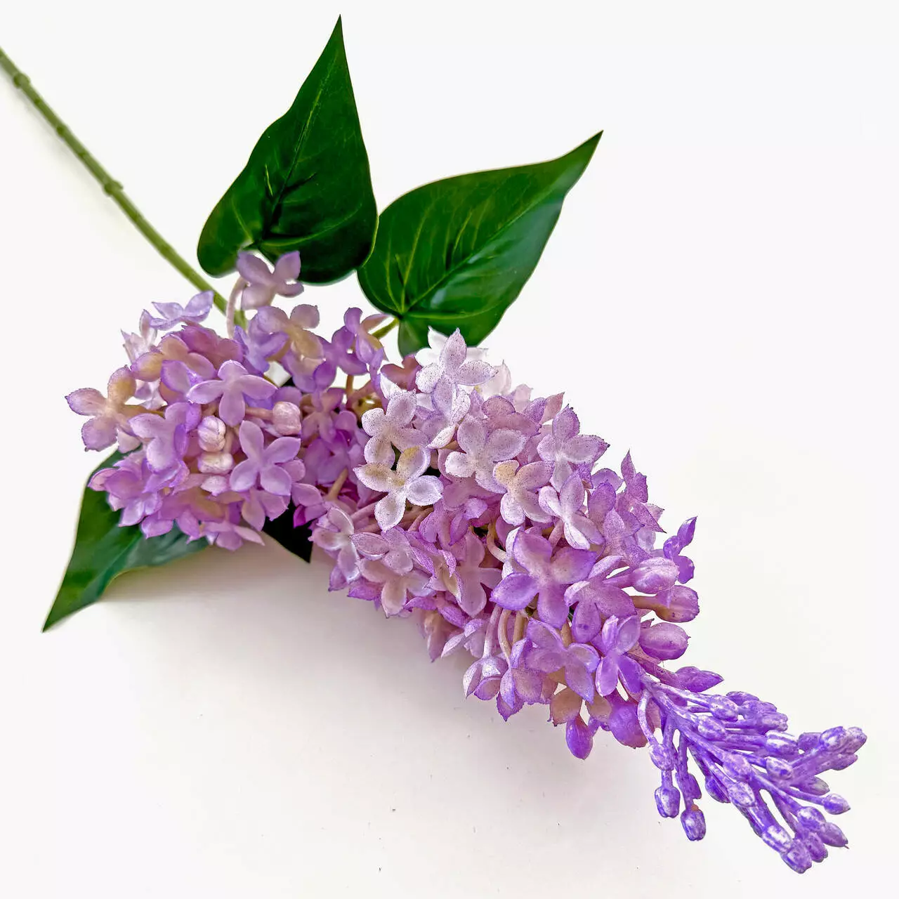 Реалістична гілка бузку з латексними квітами та декоративним листям. М’який латекс надає пелюсткам природну форму та фактуру, завдяки чому квіти виглядають максимально наближеними до живих.