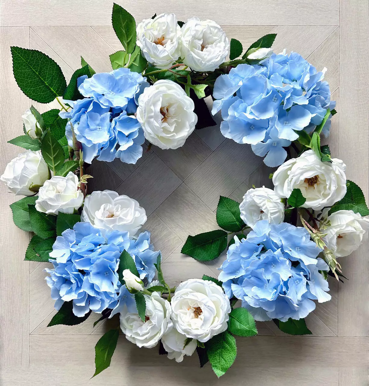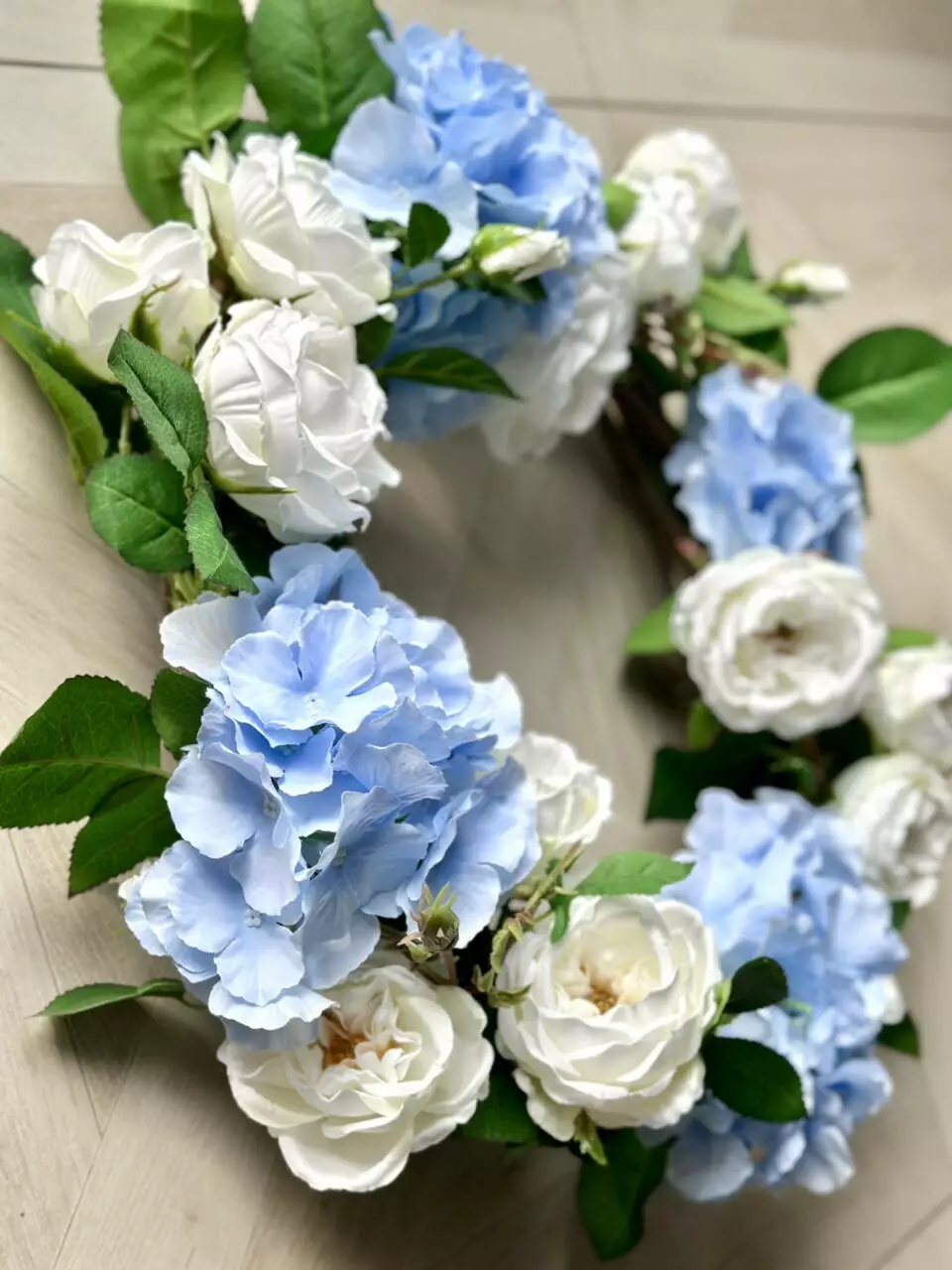 Декоративний вінок з штучних квітів Англійський сад: гортензія і троянди, 50 см