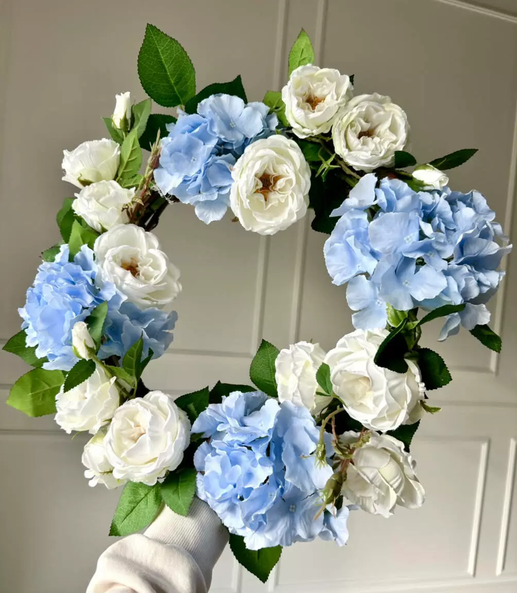 Декоративний вінок з штучних квітів Англійський сад — це вишуканий акцент для вашого інтер’єру, що втілює естетику аристократичного саду. Гармонійне поєднання блакитної гортензії та білих англійських троянд створює ніжну і водночас елегантну атмосферу. Натуральна основа з гілок гліцинії додає вінку природної текстури й витонченого шарму.