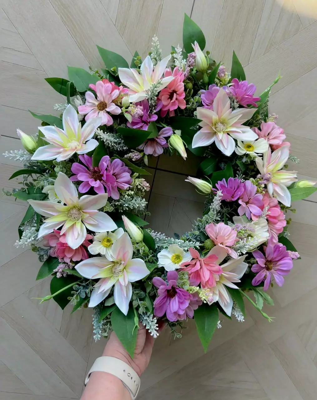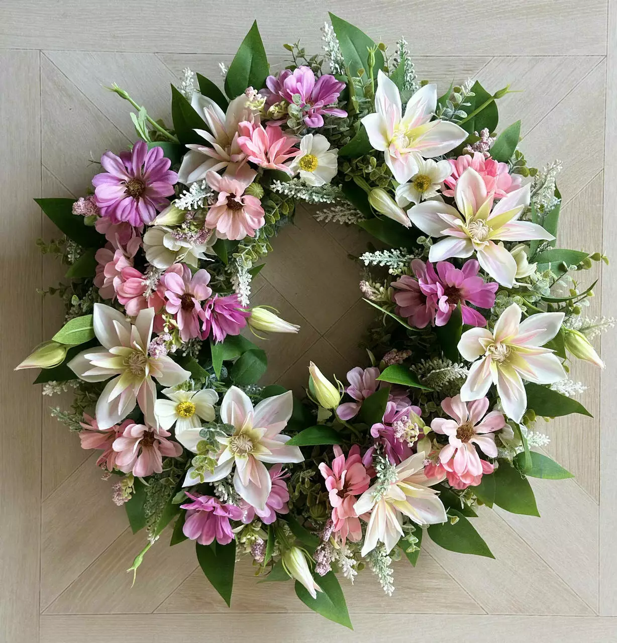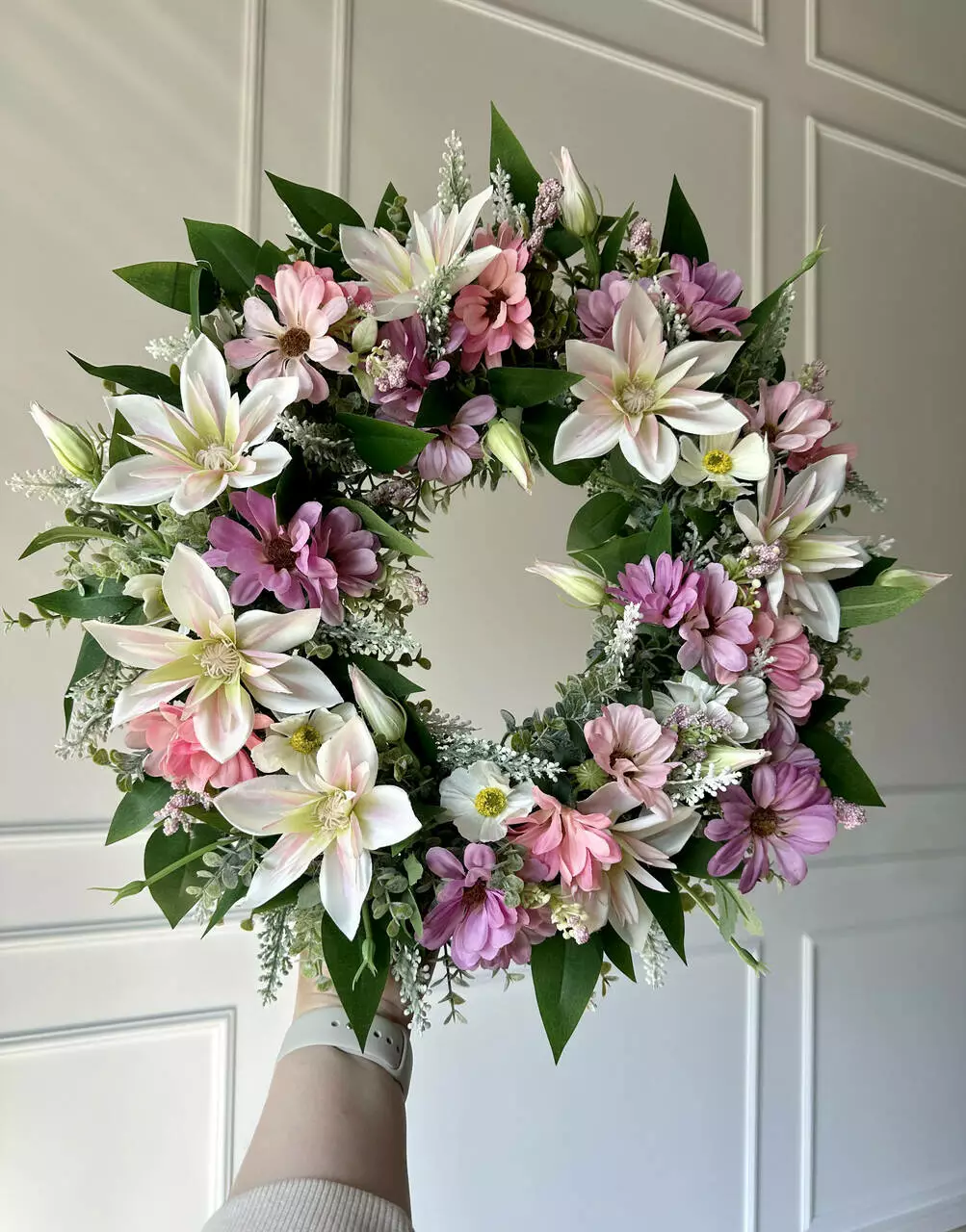 Декоративний вінок з штучних квітів «Весняний гай» діаметром 50 см — це витвір ручної роботи, натхненний природною красою саду у розквіті. Реалістичні клематиси, космеї й хризантеми у ніжних відтінках рожевого, білого та бузкового гармонійно поєднуються з зеленою рослинністю, створюючи легку, повітряну композицію.