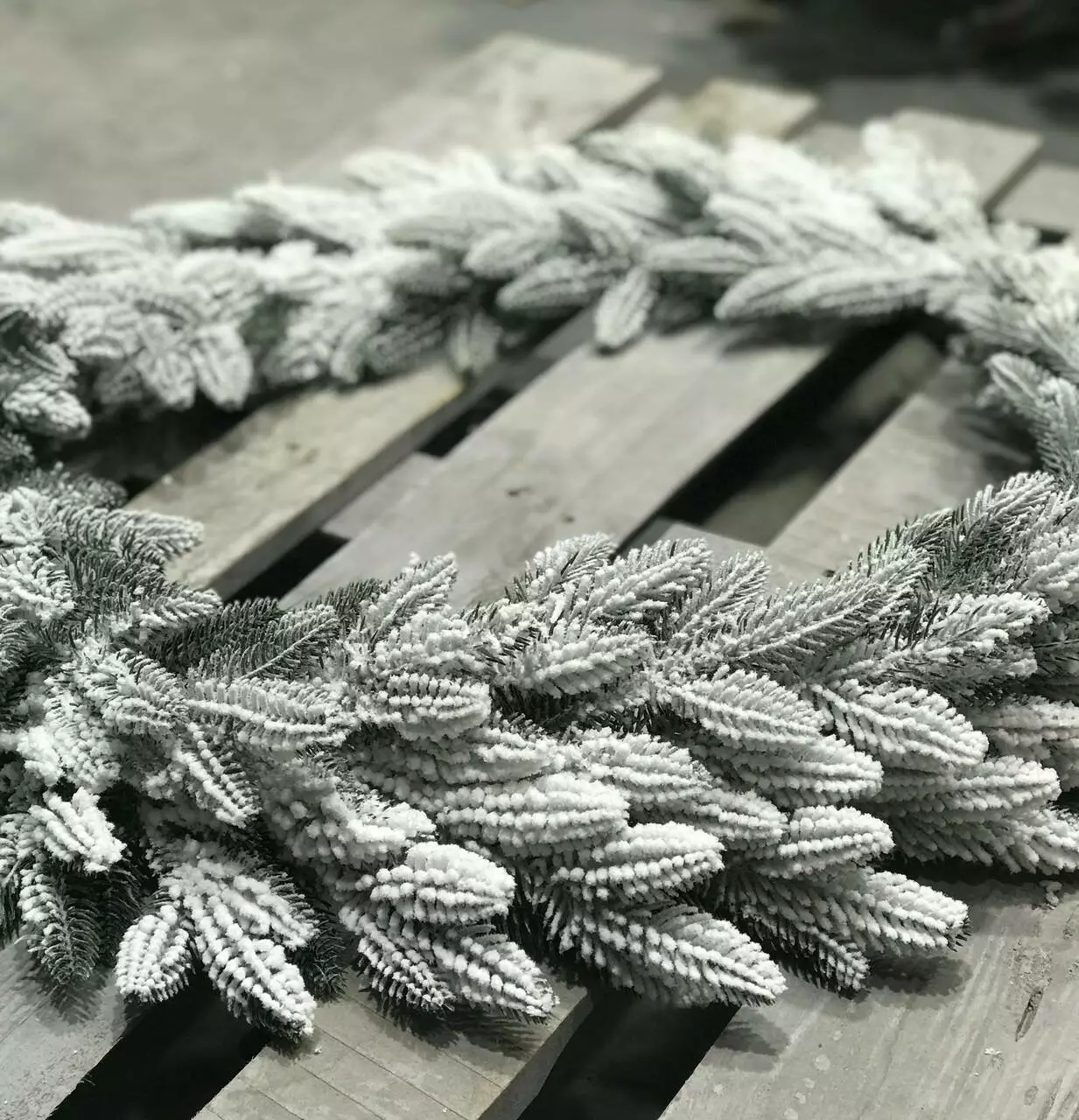 Хвойна гірлянда виготовлена з переплетених штучних ялинових гілочок. Всі гілки і голочки - 100% литі, вони виглядають, як хвоя живої ялинки, але м'якші і не колючі. Об'ємне густе напилення реалістично імітує сніг, який щойно впав на гілки пухнастими пластівцями. Матеріалом розпилення є натуральна бавовна, вона екологічна і не має запаху, безпечна для дітей і дорослих.