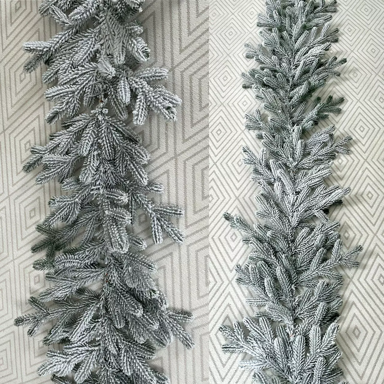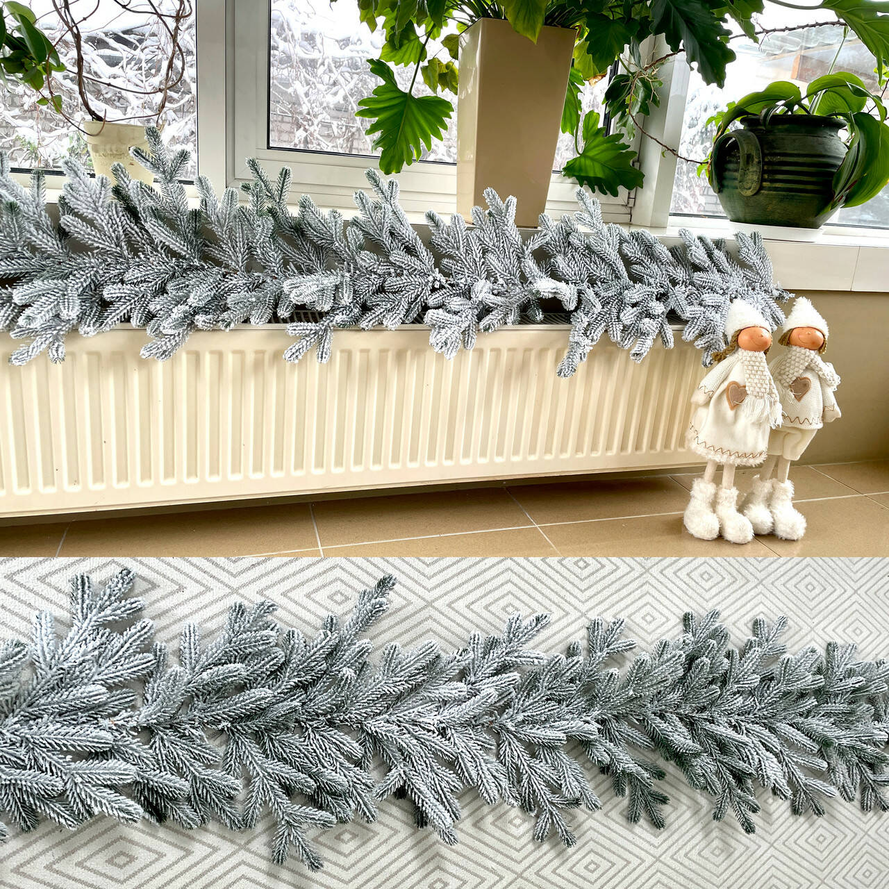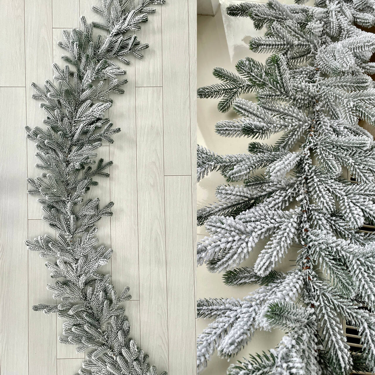 Хвойна гірлянда виготовлена з переплетених штучних ялинових гілочок. Всі гілки і голочки - 100% литі, вони виглядають, як хвоя живої ялинки, але м'якші і не колючі. Об'ємне густе напилення реалістично імітує сніг, який щойно впав на гілки пухнастими пластівцями. Матеріалом розпилення є натуральна бавовна, вона екологічна і не має запаху, безпечна для дітей і дорослих.