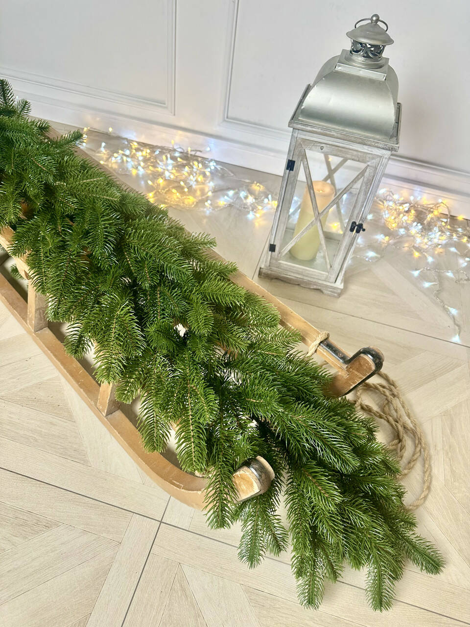 Довжина гірлянди становить 2 метри, а у розправленому вигляді її ширина — близько 30 см, що дозволяє використовувати її як самостійну прикрасу або як основу для святкових композицій. Вона гнучка та добре тримає форму, тому легко підходить для декору камінних полиць, столів, перил, вхідних зон, полиць, фотолокацій і тематичних оформлень.