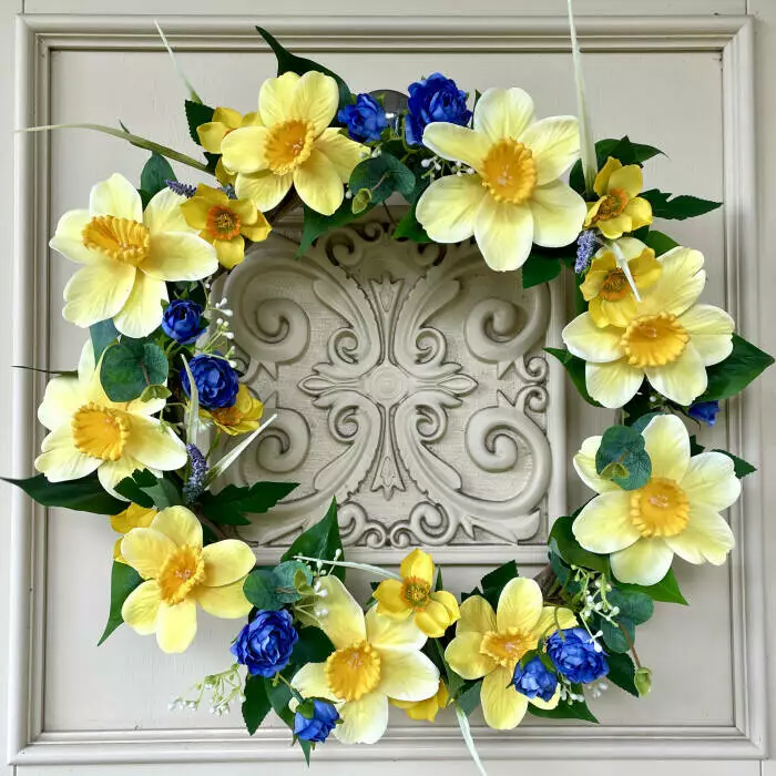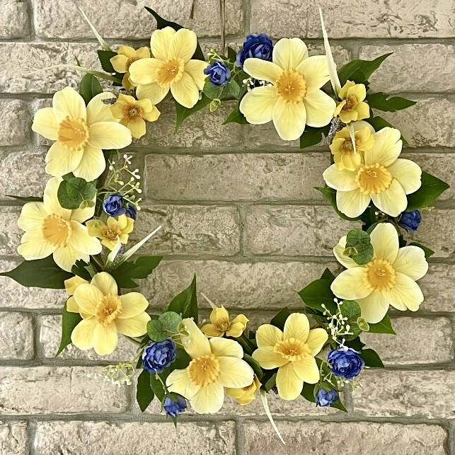 Дозвольте весняному настрою заселитися у вашому домі за допомогою цього чарівного інтер'єрного віночка "Нарциси". Виготовлений у відтінках жовтого та блакитного, він ніжно розквітає, використовуючи яскраві латексні нарциси та дрібні весняні квіти.