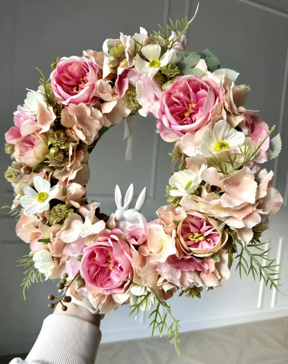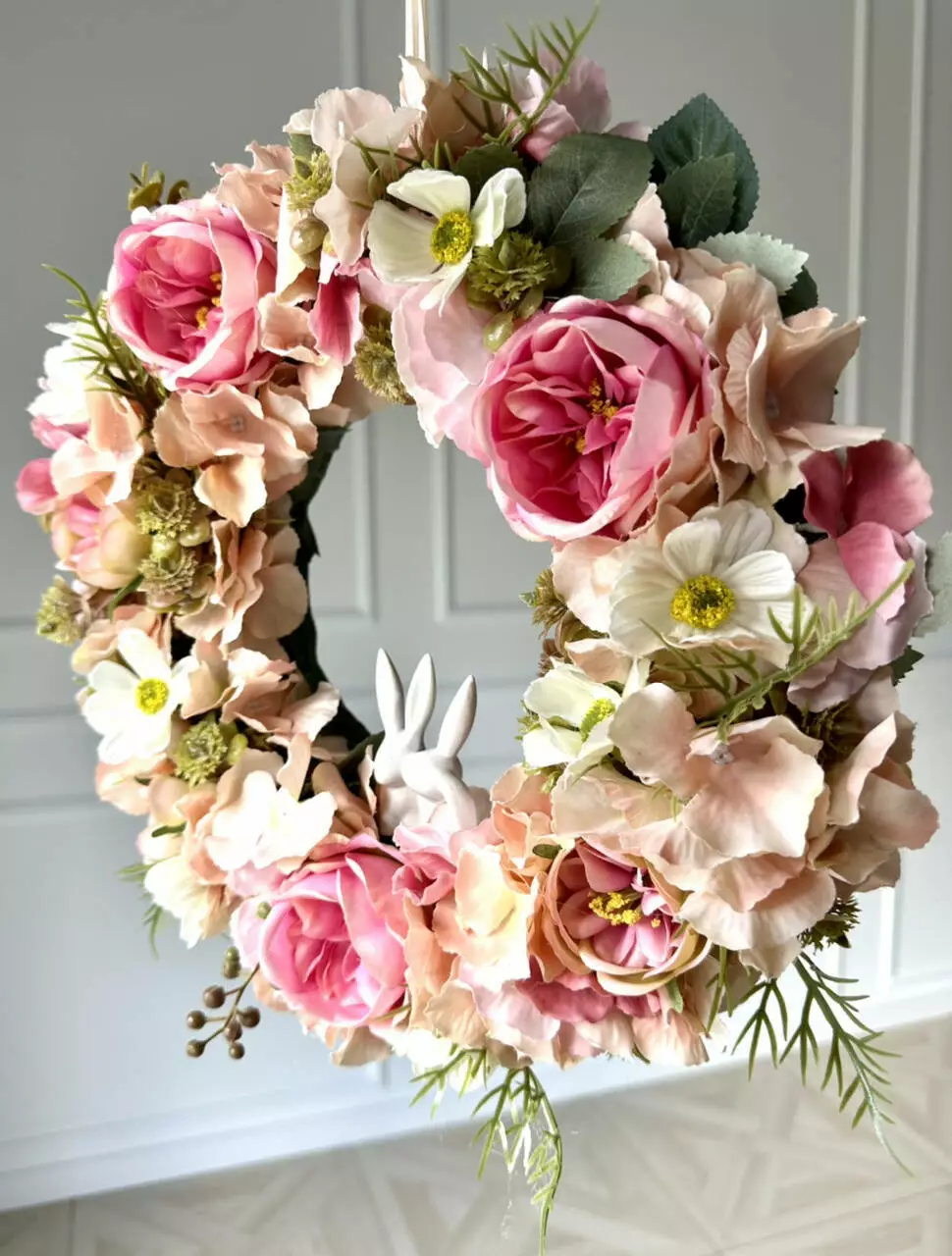 Інтер'єрний вінок на двері з штучних квітів Ніжність: троянда, гортензія, космея і керамічні зайчики, 35 см