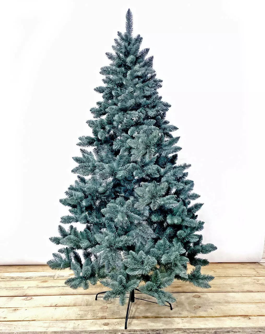 Надзвичайно пишна новорічна красуня. Густі гілки з чотирьох шарів полімерної плівки мають гарну загострену на кінчиках форму. Хвоя благородного блакитного кольору, як у живої ялинки.
