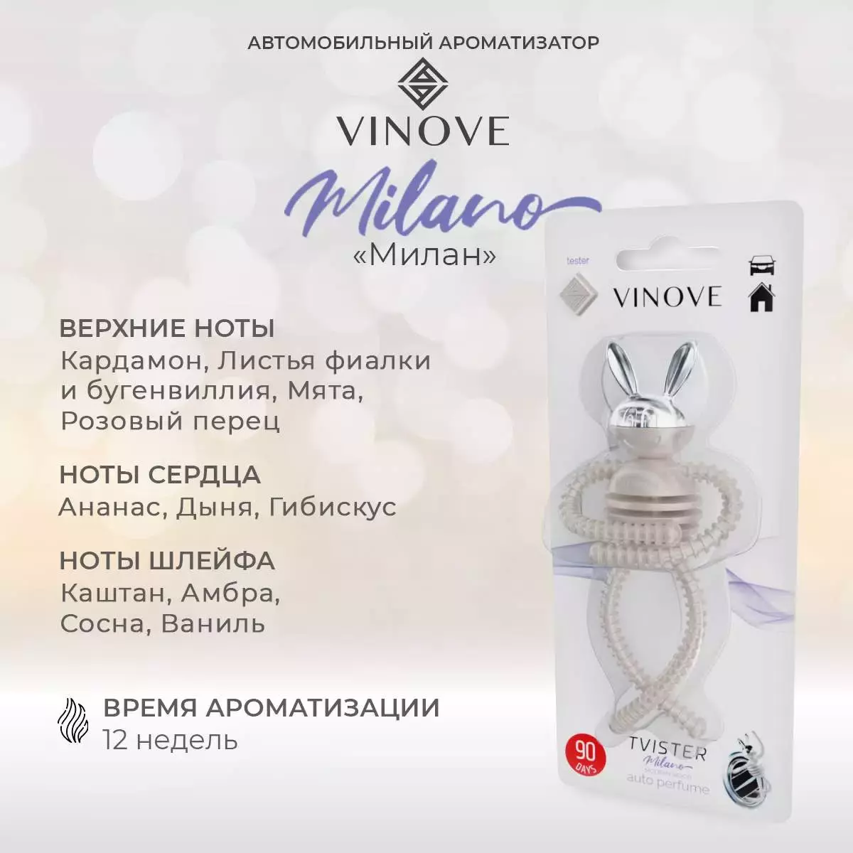 Ароматизатори для автомобілів VINOVE виділяють аромат протягом не менше 90 днів. Аромат повільно виділяється завдяки концентрованим парфумам та високотехнологічним полімерам, які використовуються як ароматизатор.