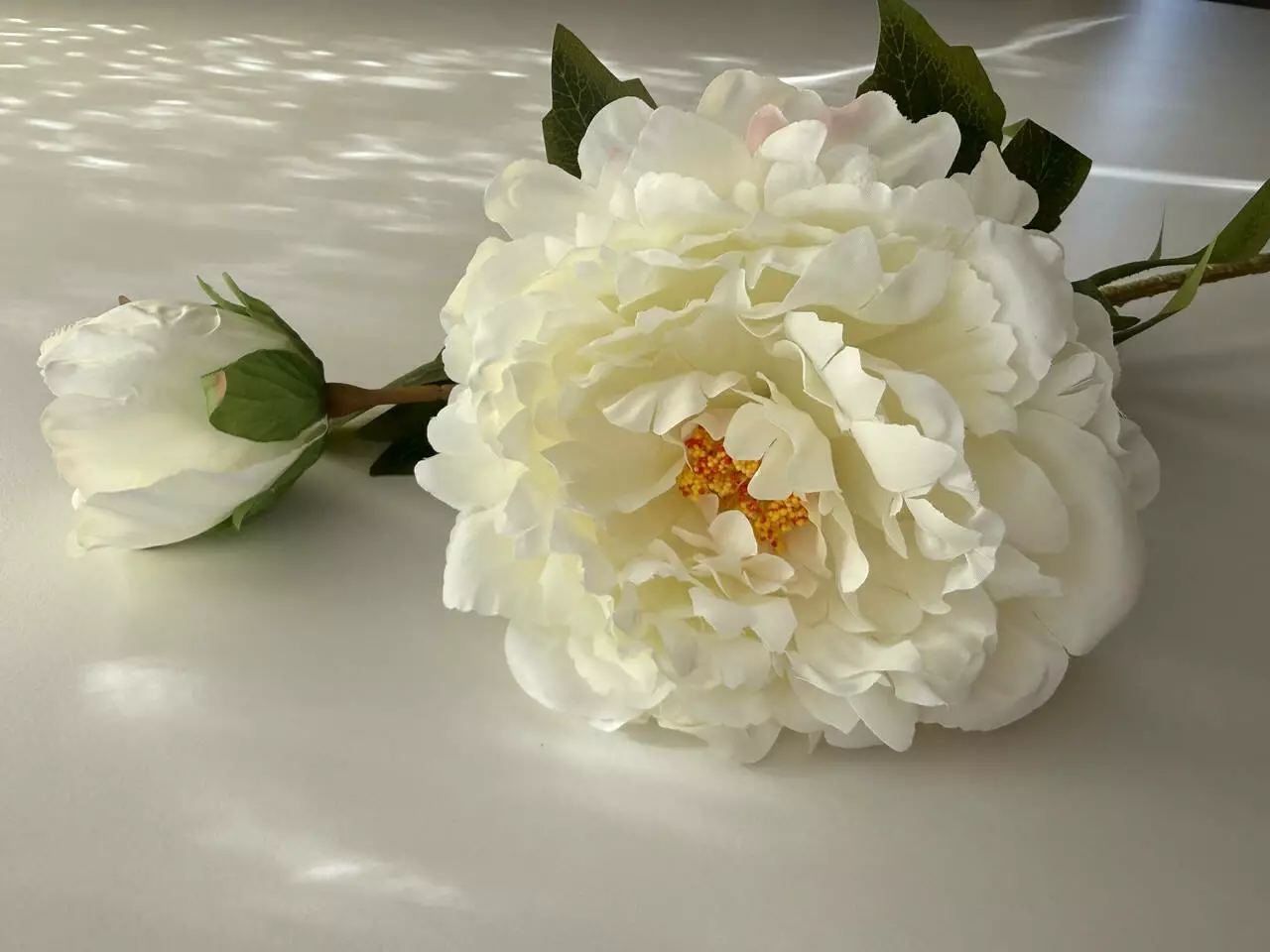 Об’ємний білий піон з максимально природною формою пелюсток і глибокою серединкою — виглядає як жива квітка у піку цвітіння. Велика головка діаметром 17 см створює виразний акцент навіть з однієї гілки.