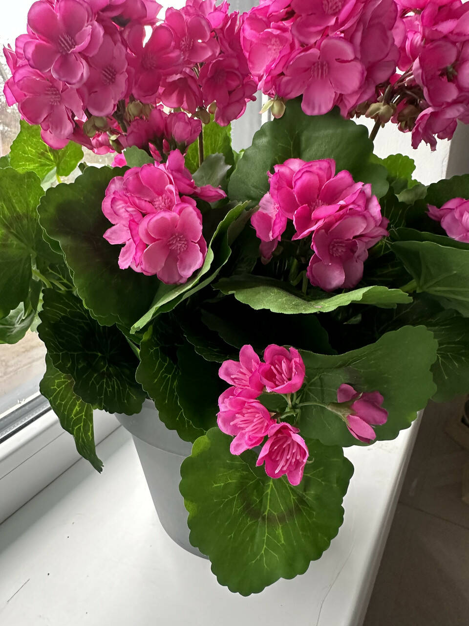 Реалістична штучна пеларгонія з щільними об’ємними суцвіттями та виразним зеленим листям. Акуратна форма, насичений колір і природний вигляд роблять її доречною як у житловому інтер’єрі, так і в комерційних просторах.