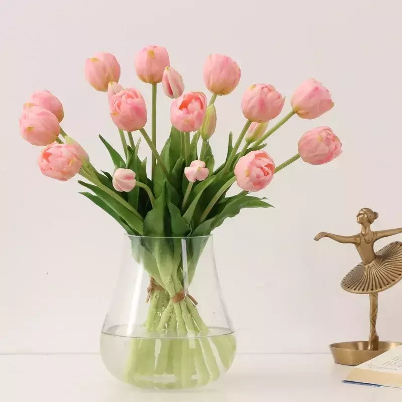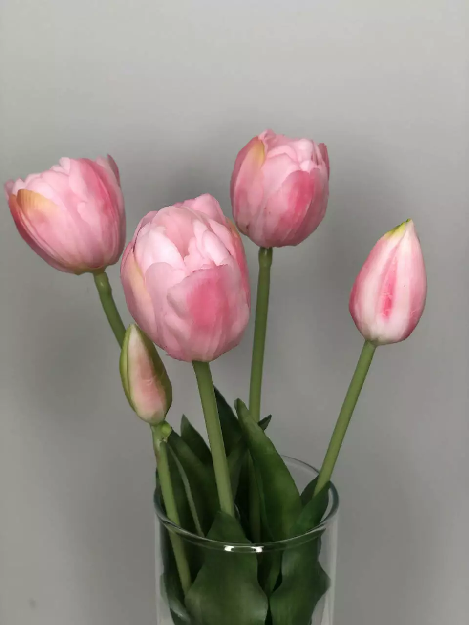 Букет штучних тюльпанів ніжно-рожевого кольору – це елегантна і витончена композиція, яка доповнить будь-який інтер'єр та створить атмосферу весни і ніжності. Завдяки реалістичному вигляду та приємній на дотик текстурі Real Touch, ці квіти виглядають як справжні.