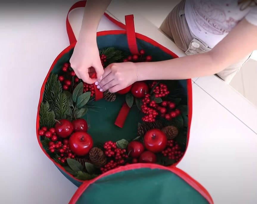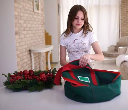 Компактна сумка-чохол для новорічного вінка або гірлянди, має зручні ручки для перенесення та надійну блискавку. Усередині чохла – стрічки із спеціальними застібками-фастексами, що забезпечують відмінну фіксацію вінка.
