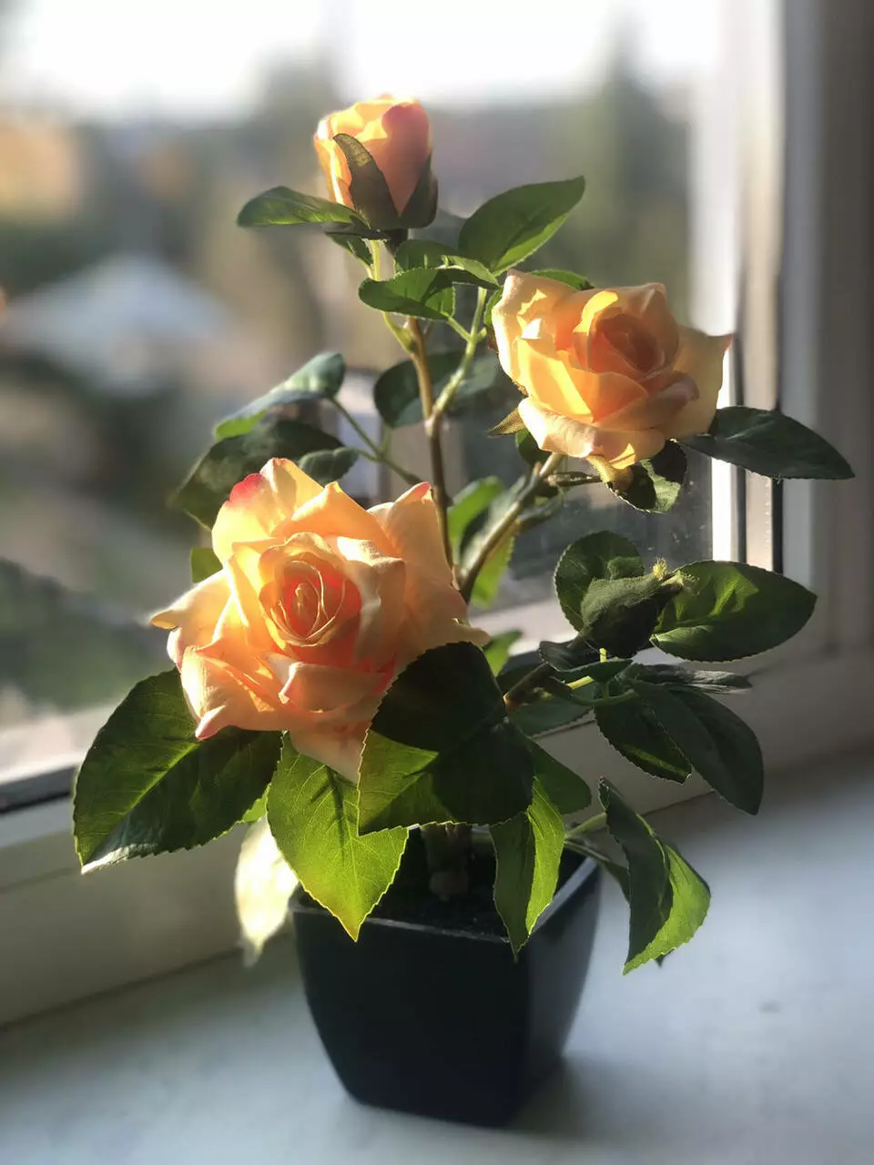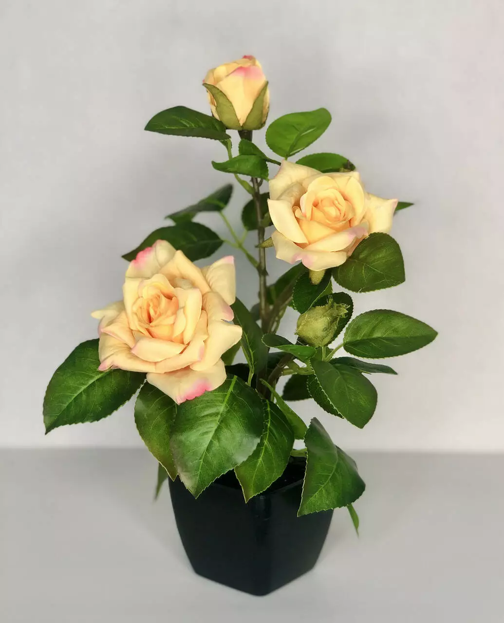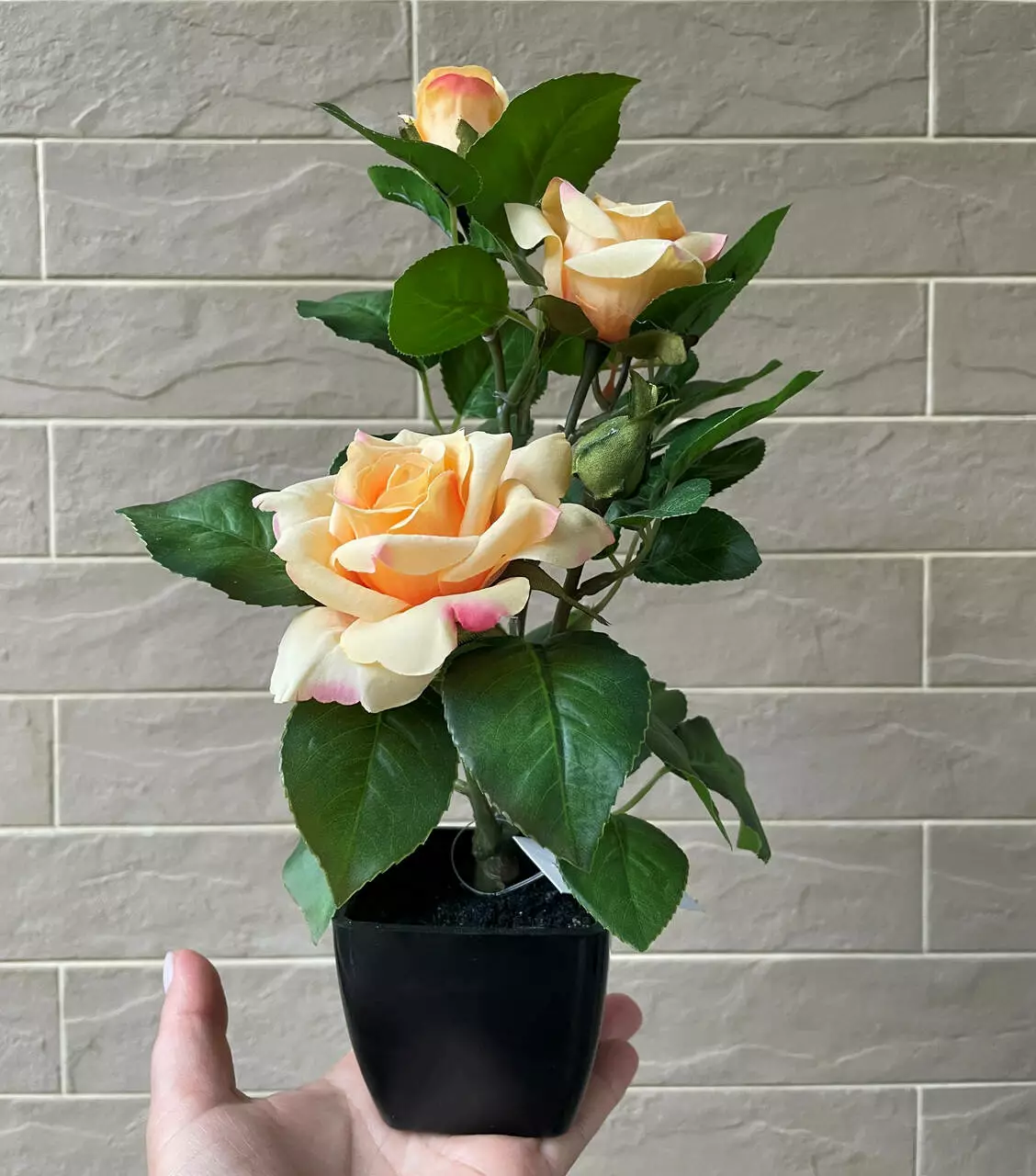 Милий кущик чайної троянди додасть вашому простору естетики та затишку. Завдяки компактним розмірам, цей вазон можна розмістити будь-де. Висота разом із горщиком становить 29 см. Троянда має три квітки і бутон, що виглядають як живі.