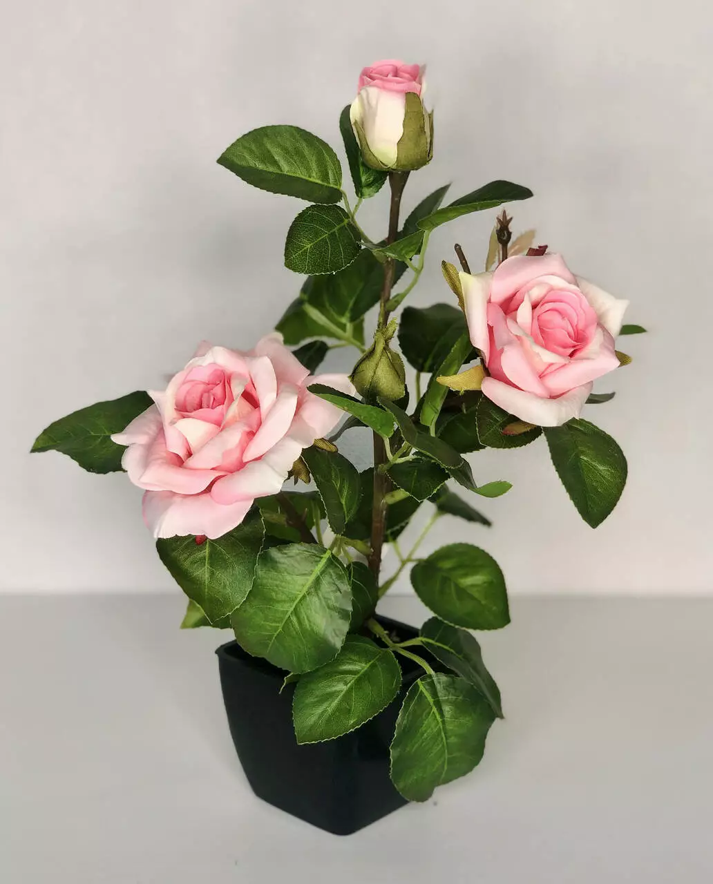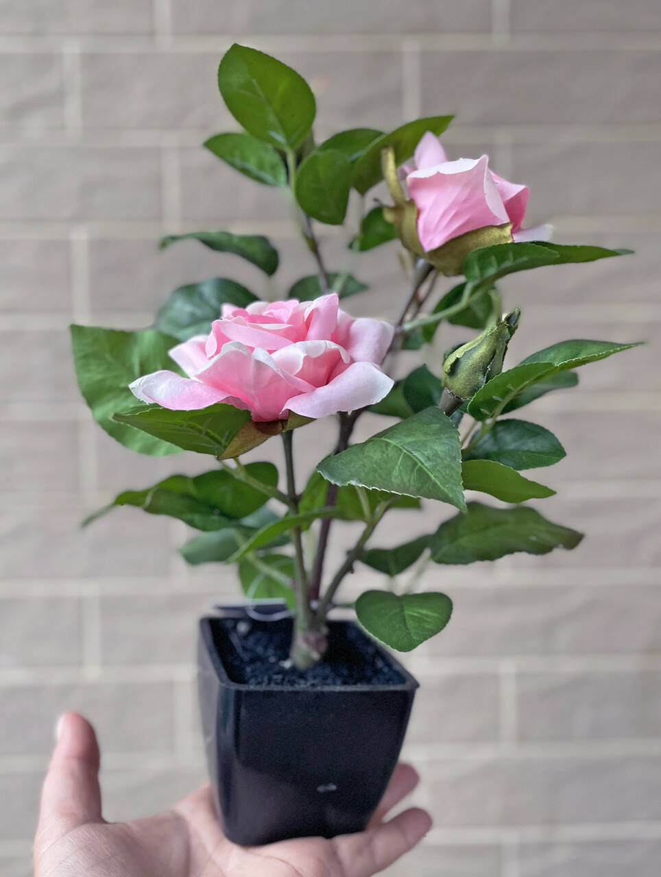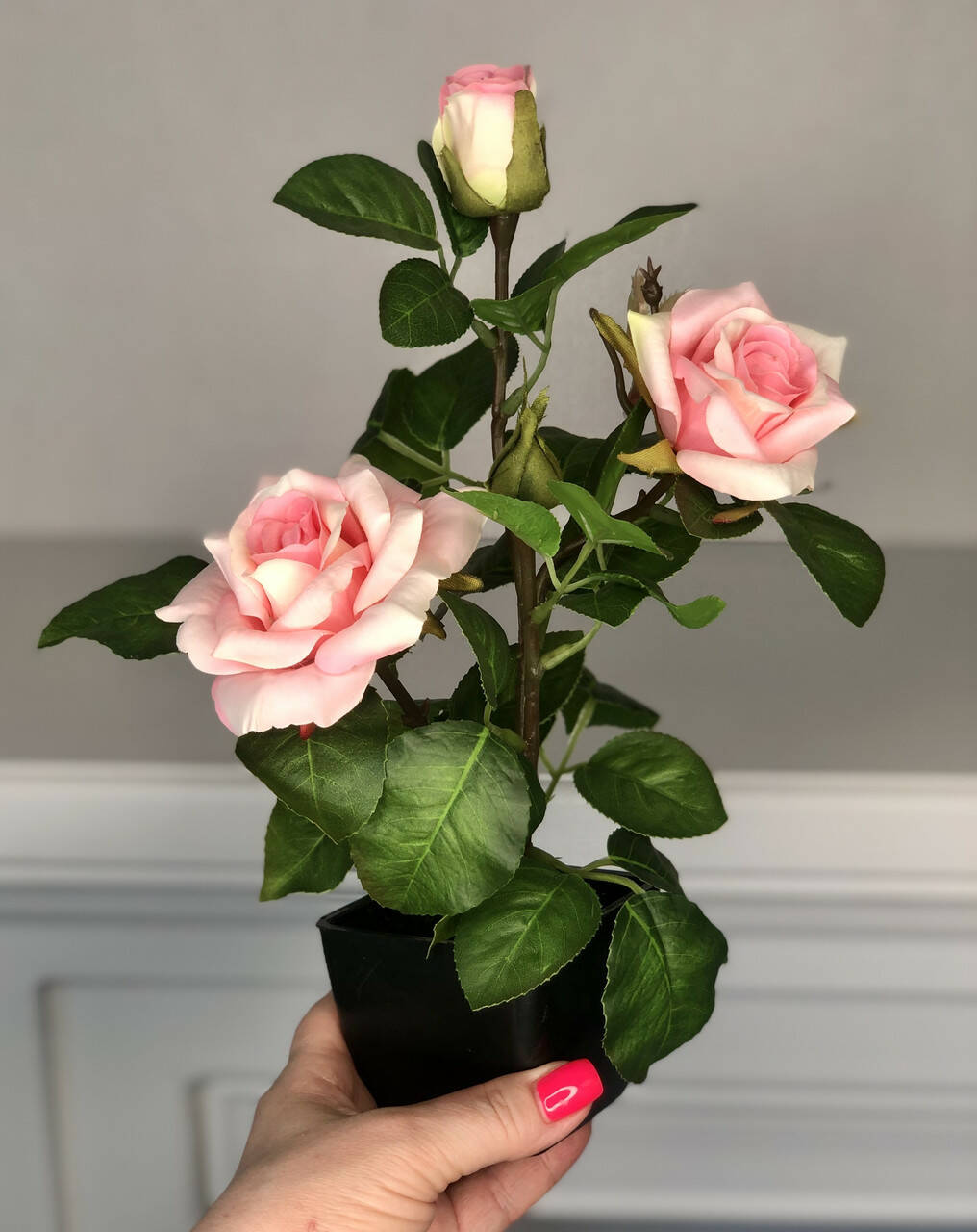 Милий кущик рожевої троянди додасть вашому простору естетики та затишку. Завдяки компактним розмірам, цей вазон можна розмістити будь-де. Висота разом із горщиком становить 29 см. Троянда має три квітки і бутон, що виглядають як живі.