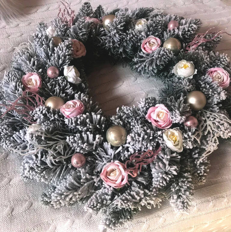 Засніжені гілочки різдвяного вінка серії Elegant мають кінчики загостреної форми. Вінок виготовлений з м'якого пластику ПВХ. Діаметр вінка по зовнішньому краю 50 см. Об'ємне густе напилення реалістично імітує сніг, тільки що впав на гілки пухнастими пластівцями. Матеріалом розпилення є натуральна бавовна, він екологічний і не має запаху, безпечний для дітей і дорослих.