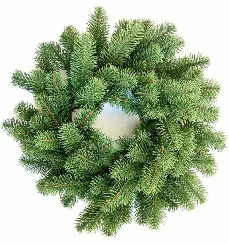 Новорічний декоративний вінок діаметром 45 см являє собою переплетені гілки штучної ялинки. Виготовлений з 100% литої хвої. Голочки як у живої ялинки, але м'які і не колючі. Без декора.