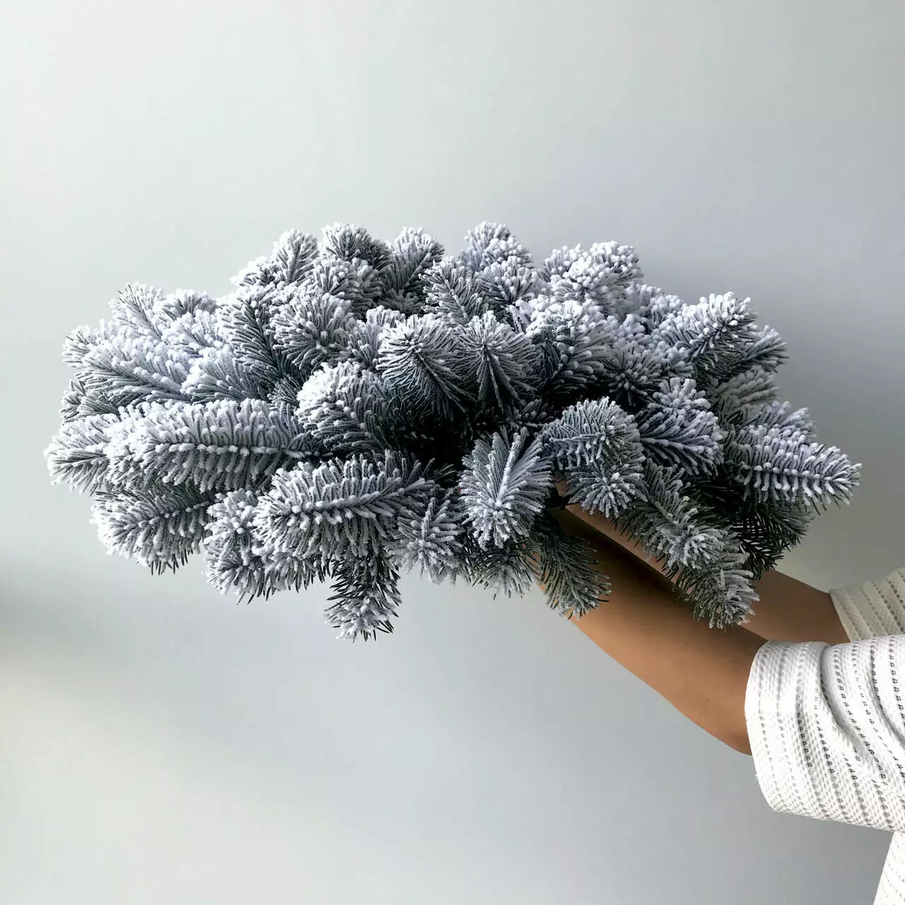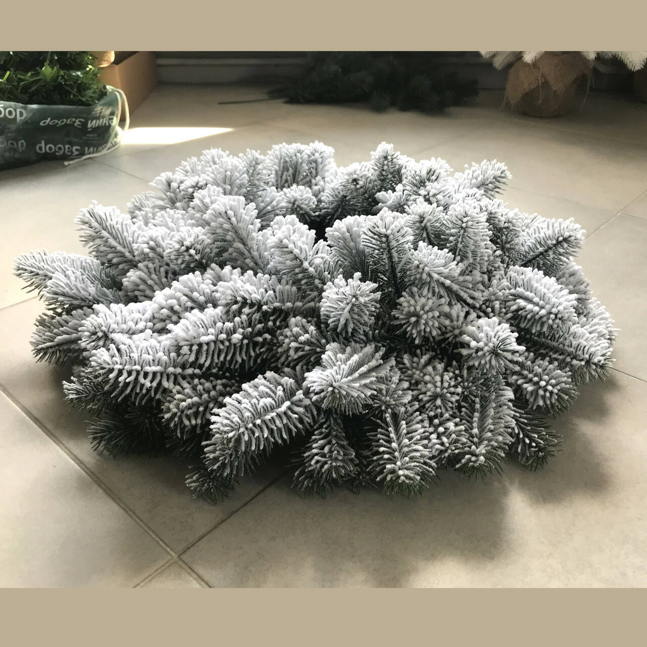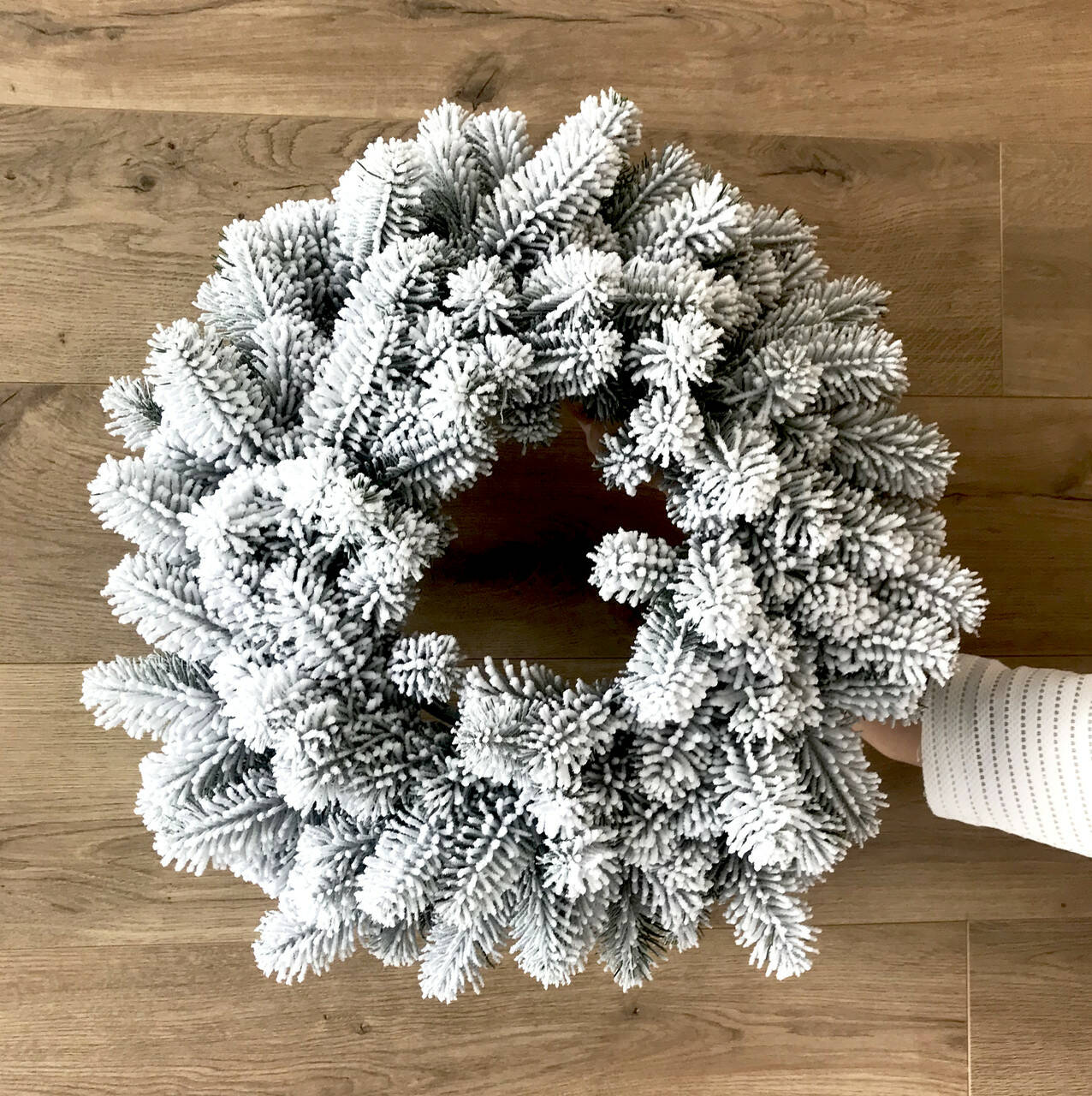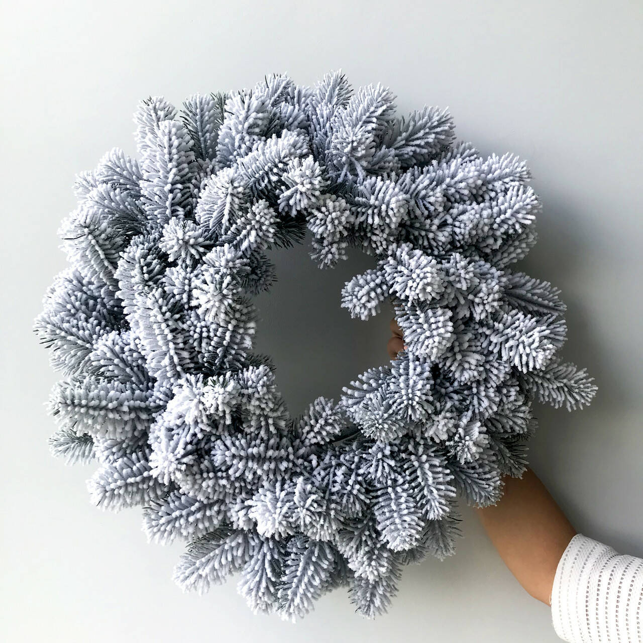 Новорічний декоративний вінок діаметром 55 см являє собою переплетені гілки штучної ялинки. Без декора. Виготовлений з 100% литої хвої. Голочки як у живої ялинки, але м'які і не колючі. Об'ємне густе напилення на вінку, реалістично імітує сніг, тільки що впав на гілки пухнастими пластівцями. Матеріалом розпилення є натуральна бавовна, вона екологічна і не має запаху, безпечна для дітей і дорослих.