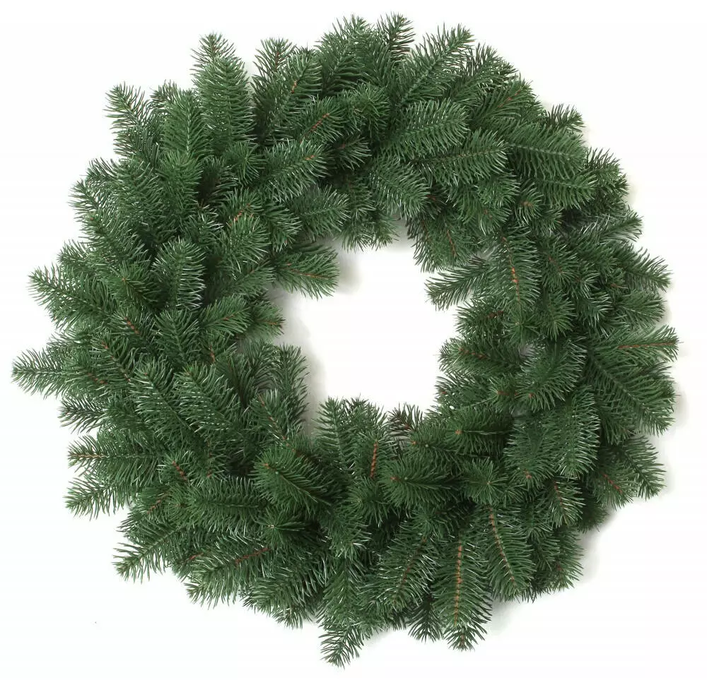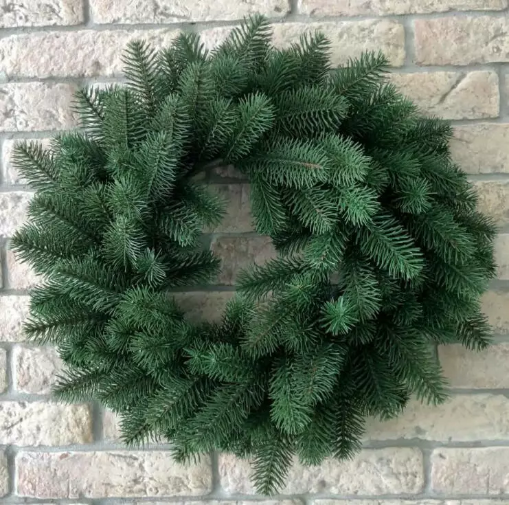 Новорічний декоративний вінок діаметром 55 см являє собою переплетені гілки штучної ялинки. Виготовлений з 100% литої хвої. Голочки як у живої ялинки, але м'які і не колючі. Без декору.