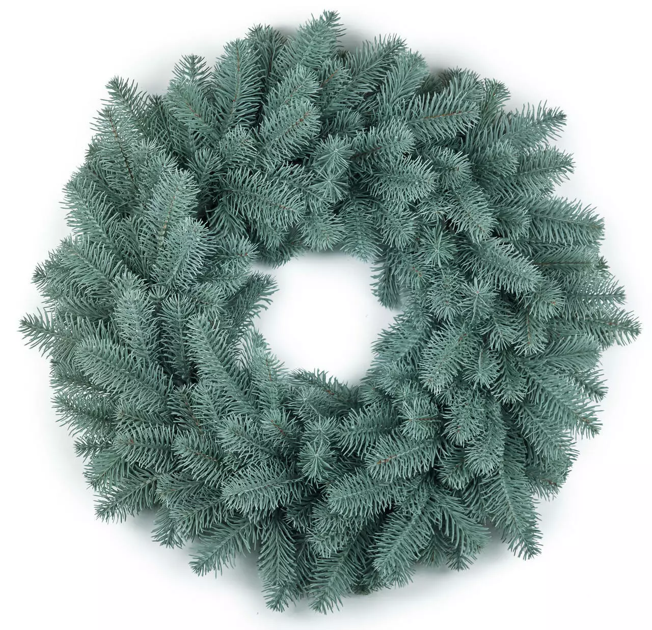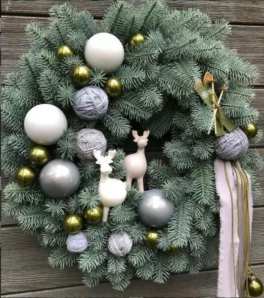 Великий і розкішний різдвяний вінок з діаметром 60 см по зовнішньому краю виготовлений шляхом переплетення штучних ялинових гілок. Хвоя 100% лита, тому виглядає приголомшливо реалістично. Голочки як у живої блакитної ялинки, але м'якші і не колючі. Ідеально підійде для прикрашання вхідних дверей. Вінок без декору.