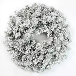 Новорічний декоративний вінок діаметром 60 см являє собою переплетені гілки штучної ялинки. Без декора. Виготовлений з 100% литої хвої. Голочки як у живої ялинки, але м'які і не колючі. Об'ємне густе напилення на вінку, реалістично імітує сніг, тільки що впав на гілки пухнастими пластівцями. Матеріалом розпилення є натуральна бавовна, вона екологічна і не має запаху, безпечна для дітей і дорослих.