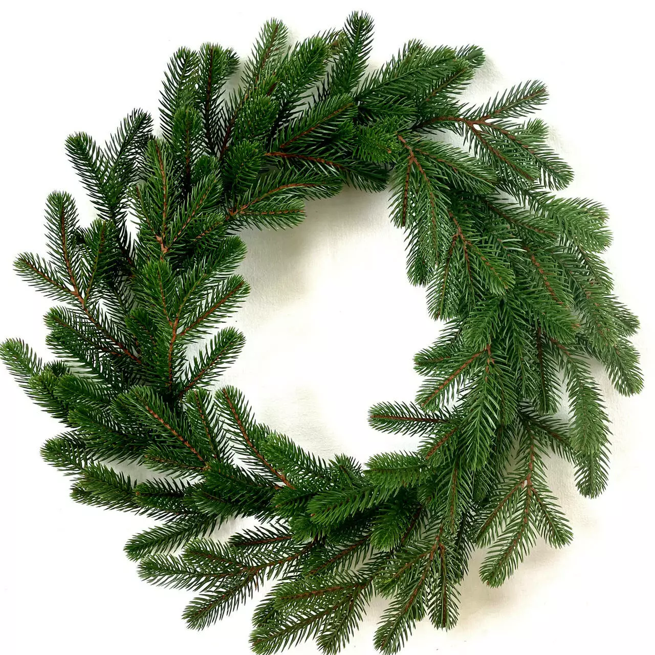 Новорічний декоративний вінок діаметром 50 см являє собою переплетені гілки штучної ялинки. Виготовлений з 100% литої хвої. Голочки як у живої ялинки, але м'які і не колючі. Без декору.