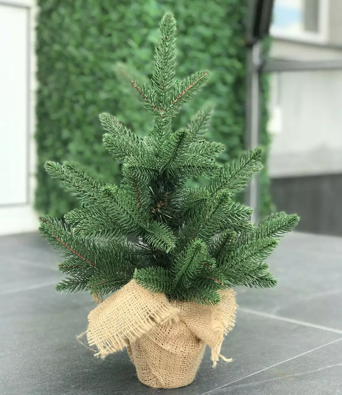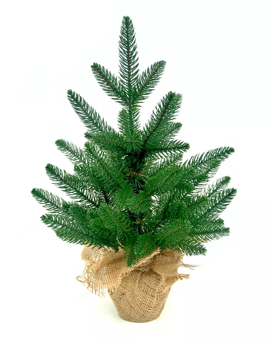 Компактна штучна лита ялинка виглядає ошатно навіть без додаткових прикрас. Всі голочки - литі, точна 3D імітація хвої живої ялинки. Встановлена у горщик, прикрашений мішковиною, з обважнювачем всередині - для захисту від перекидання.